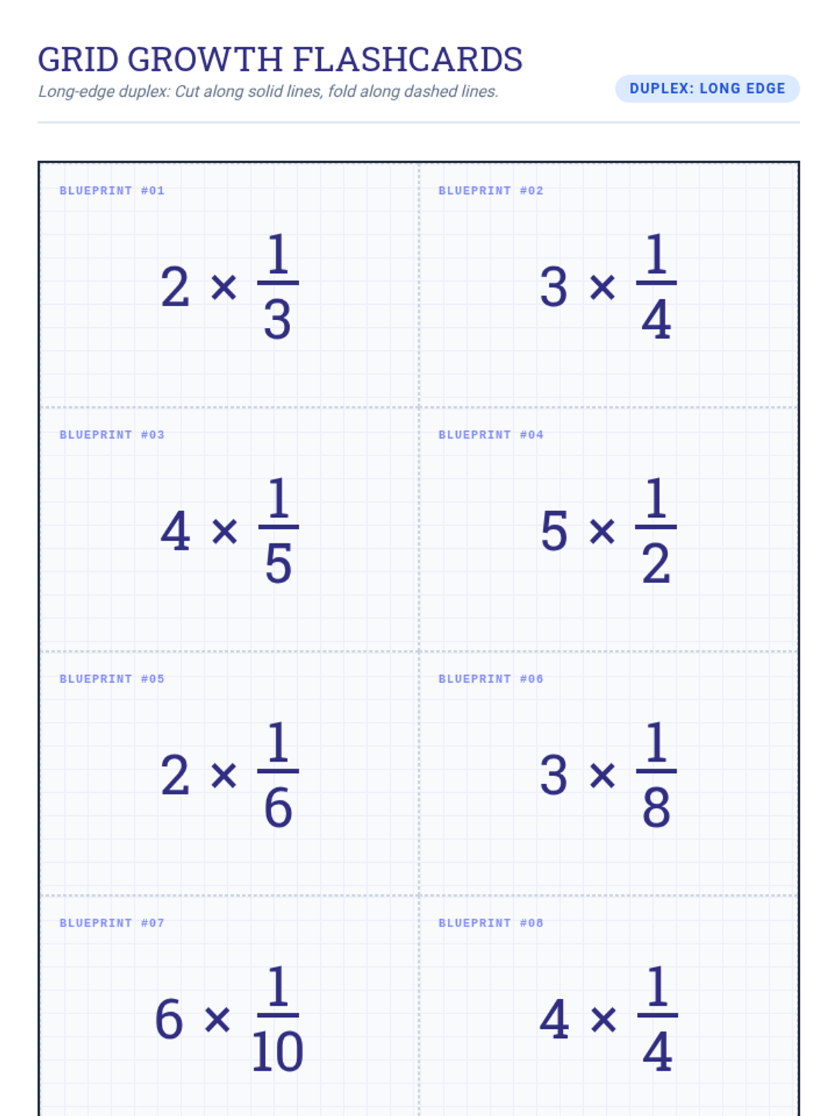 A set of printable multiplication flashcards featuring whole number and unit fraction problems with visual area model answers. Designed for double-sided printing.
