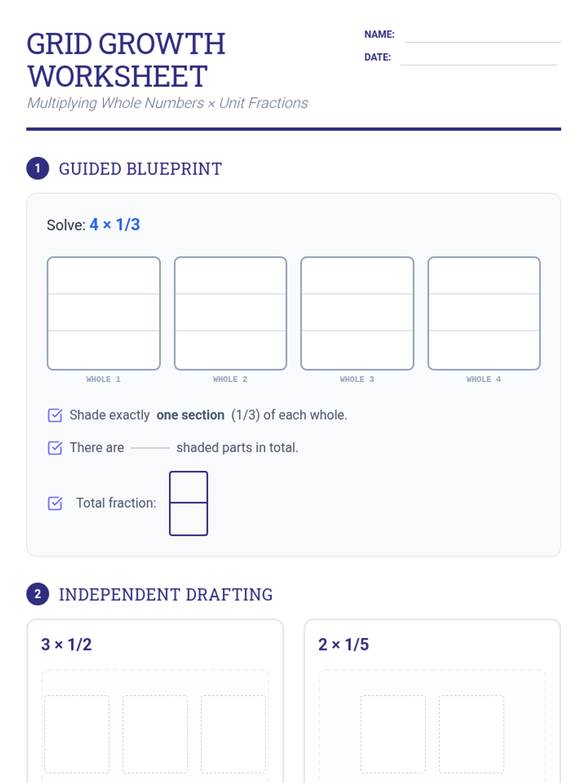 A student practice sheet for modeling multiplication of whole numbers by unit fractions using area models.