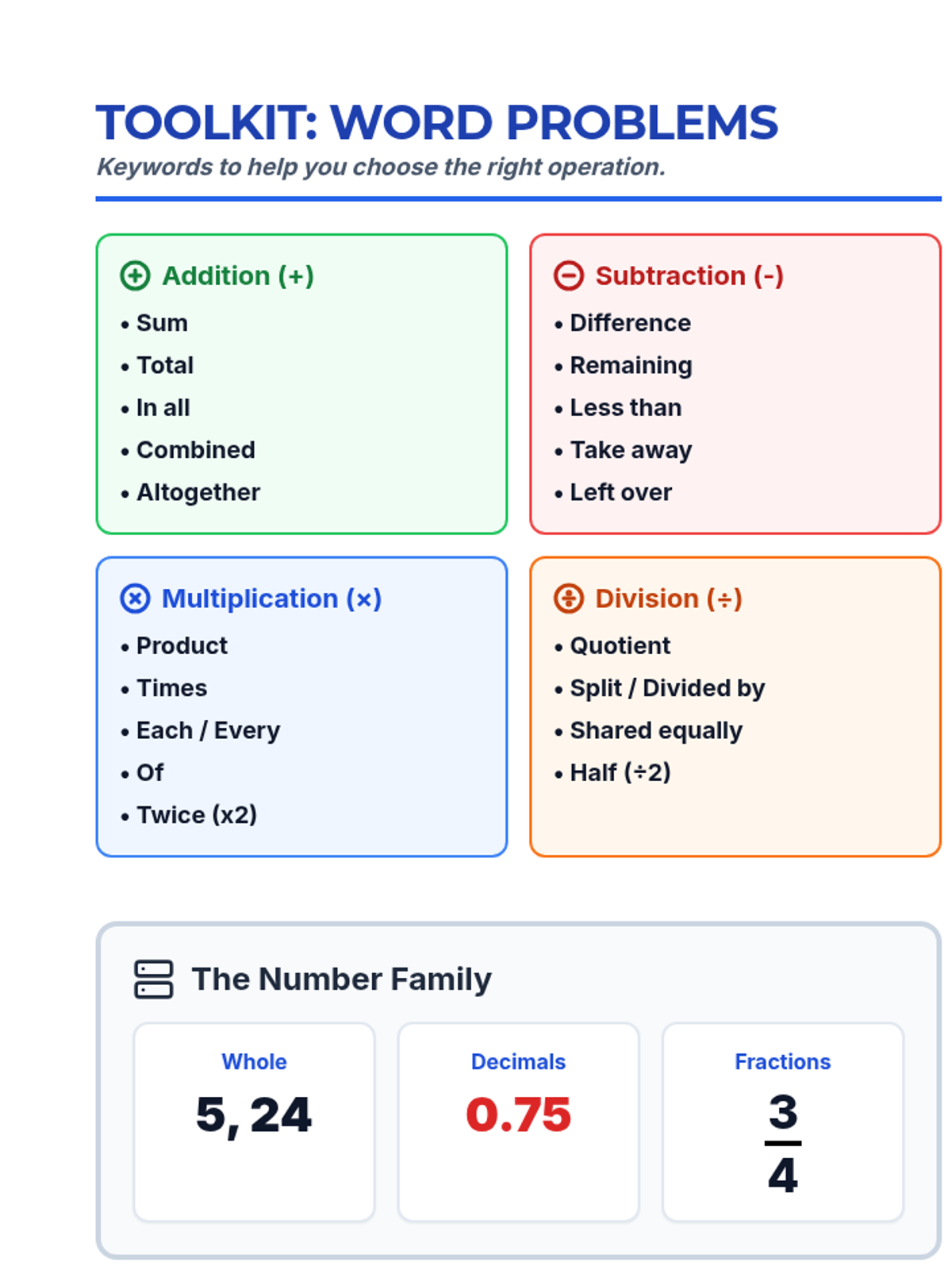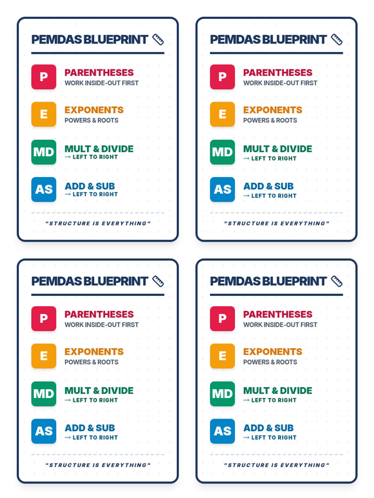 A compact, printable reference card (cheat sheet) for students' desks, reinforcing the color-coded PEMDAS order of operations with visual icons and reminders. 4-up layout for efficiency.