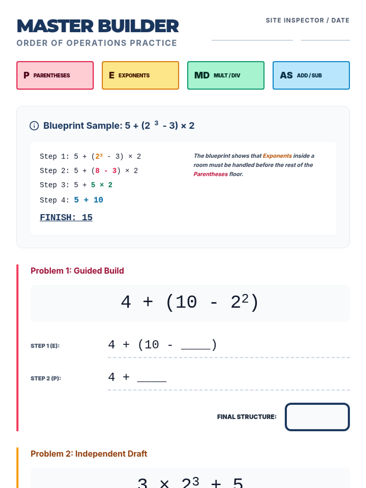 A 2-page guided practice worksheet featuring a color-coded PEMDAS reference, a worked example, and tiered problems with dedicated workspaces and checklists. Tightened layout and improved contrast. Student work area for Problem 2 fixed.