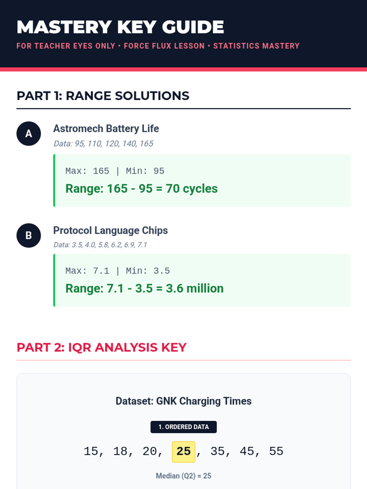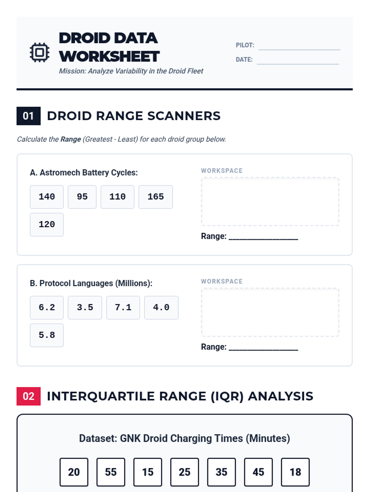 A student-facing worksheet featuring droid specifications. Includes sections for calculating Range, a step-by-step IQR guide, and a critical thinking question on outliers. Revised for droid-specific data and optimized layout.
