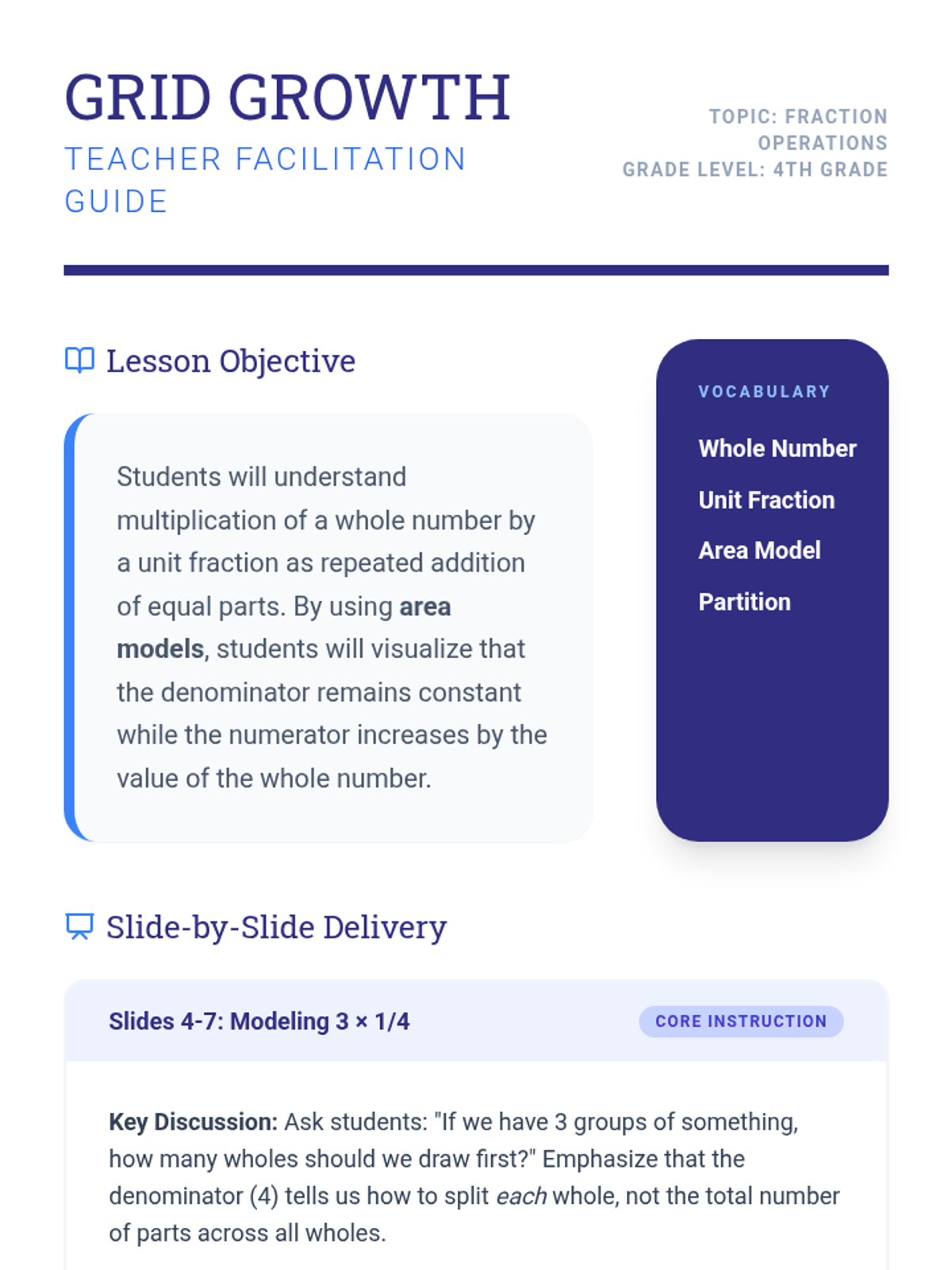 A comprehensive teacher guide for facilitating the Grid Growth lesson on multiplying whole numbers by unit fractions.