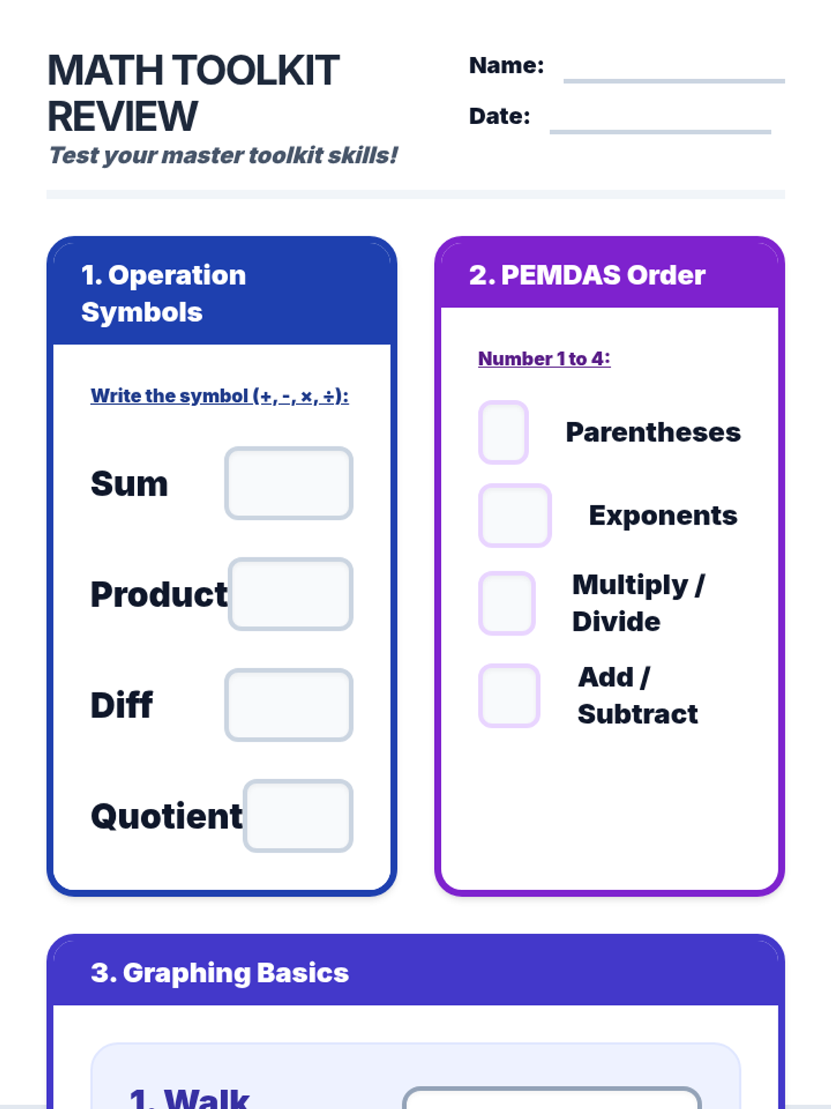 A comprehensive two-page practice worksheet to accompany the Math Mastery Anchor Charts, covering keywords, order of operations, geometry, fractions, and graphing with large writing areas for students.