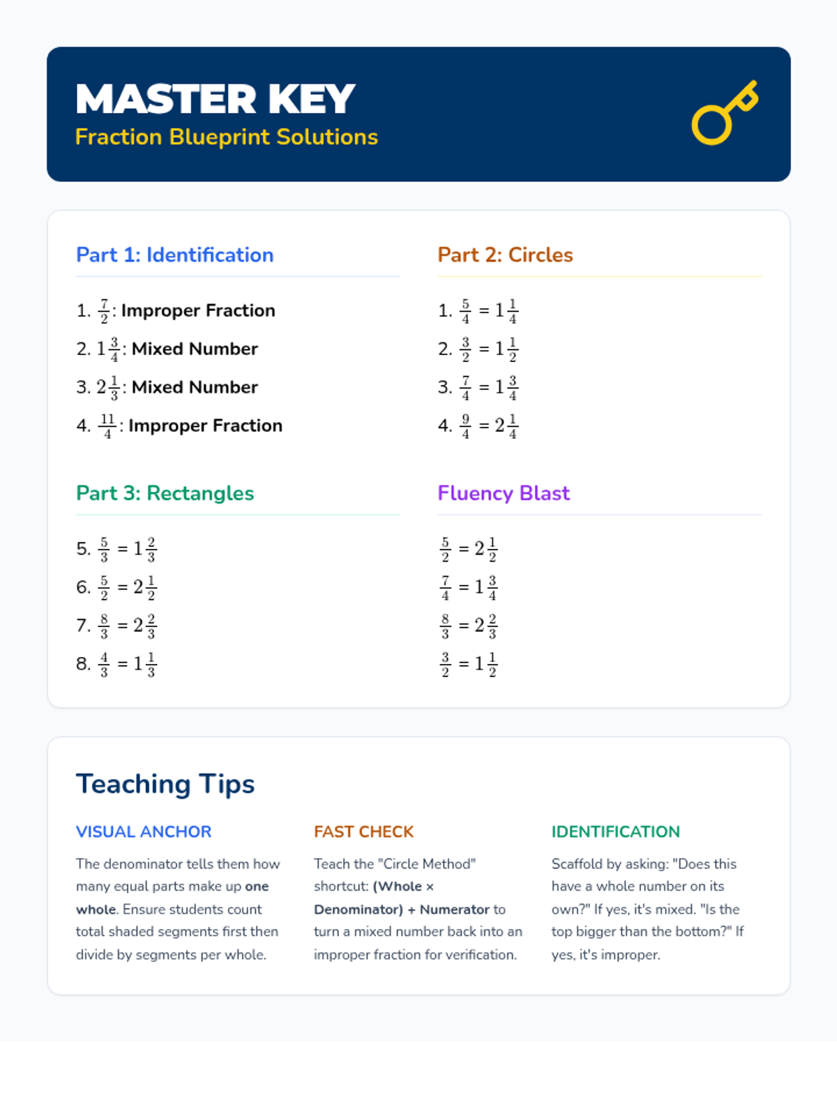 An answer key and teaching guide for the Fraction Blueprint lesson, including worksheet solutions and instructional tips.