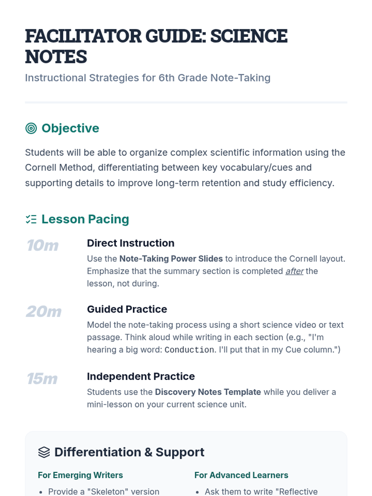 A teacher-facing facilitation guide providing instructional strategies, pacing suggestions, and differentiation tips for teaching the Cornell note-taking method in a 6th-grade science classroom.