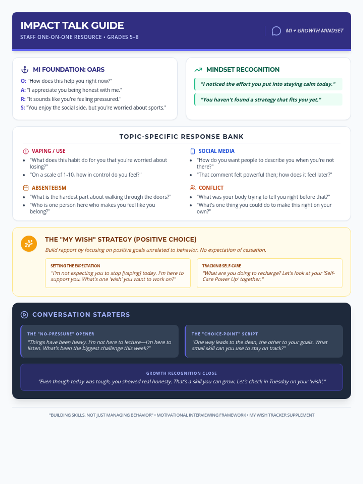 A detailed, professional one-page guide for guidance counselors and school staff. It features an expanded "Developing Discrepancy" section focusing on identifying the student's true identity before addressing risky behaviors, along with advanced MI scripts.