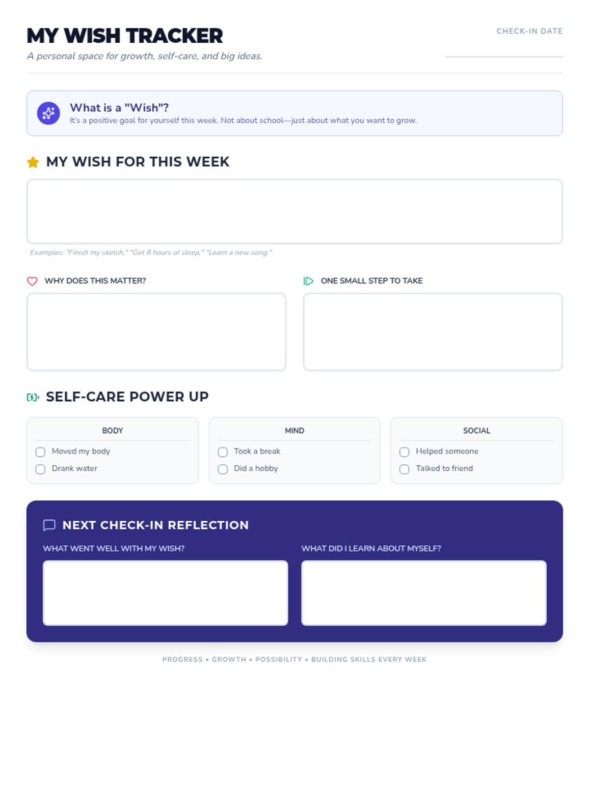 A student-facing personal reflection guide focused on identifying a positive weekly "wish" or goal unrelated to their specific challenges. It includes sections for self-care tracking and reflection for future check-ins.