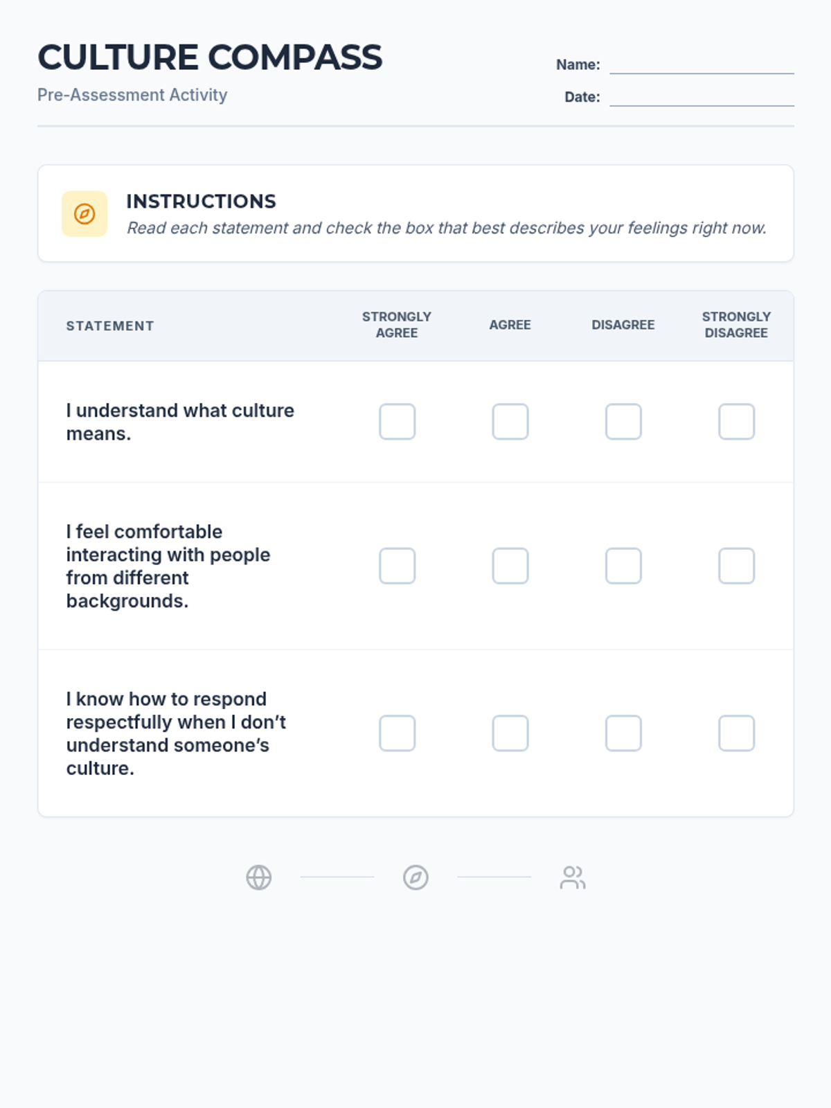 A Likert-scale pre-assessment handout for students to evaluate their baseline understanding of culture and interpersonal comfort.