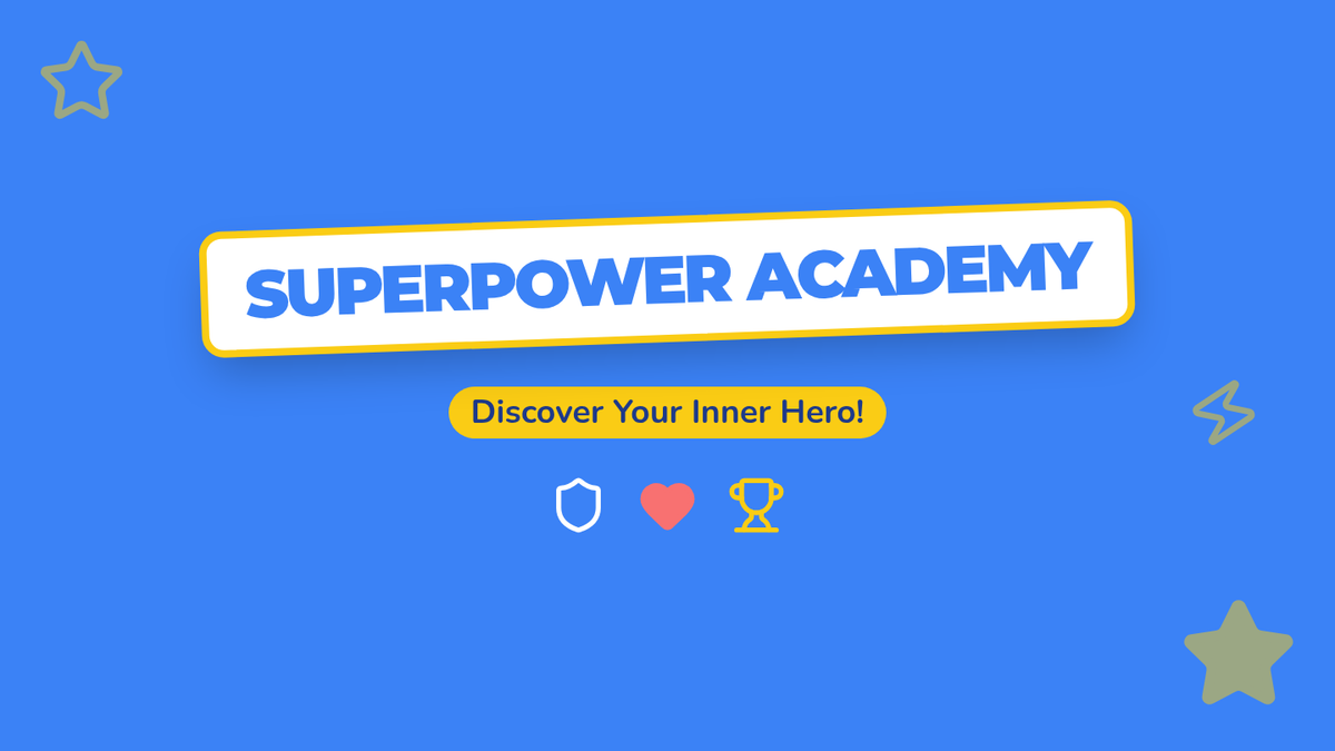 A vibrant slide deck to introduce the 'Superpower Academy' concept, defining internal strengths versus external talents and setting expectations for station-based work.