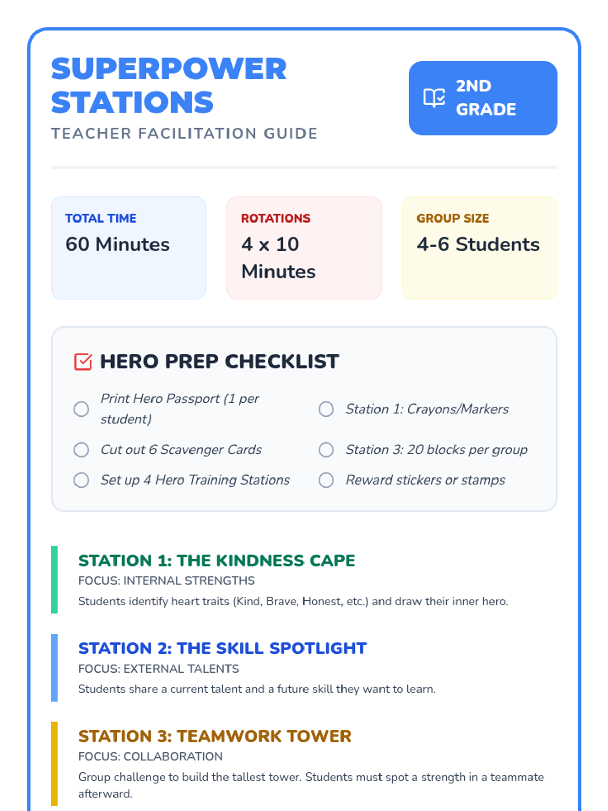 A comprehensive teacher guide for managing the station-based activities, including time breakdowns, preparation checklists, and specific facilitation strategies for 2nd graders.