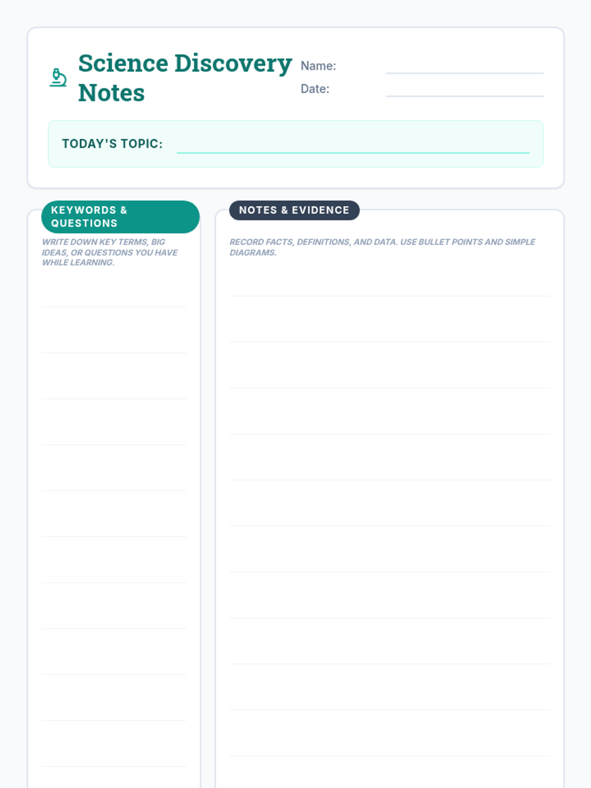 A visually engaging Cornell Notes template specifically designed for 6th-grade science students, featuring an enlarged Questions box and maximized writing area in the Notes section for better utility, consolidated to fit on a single page.