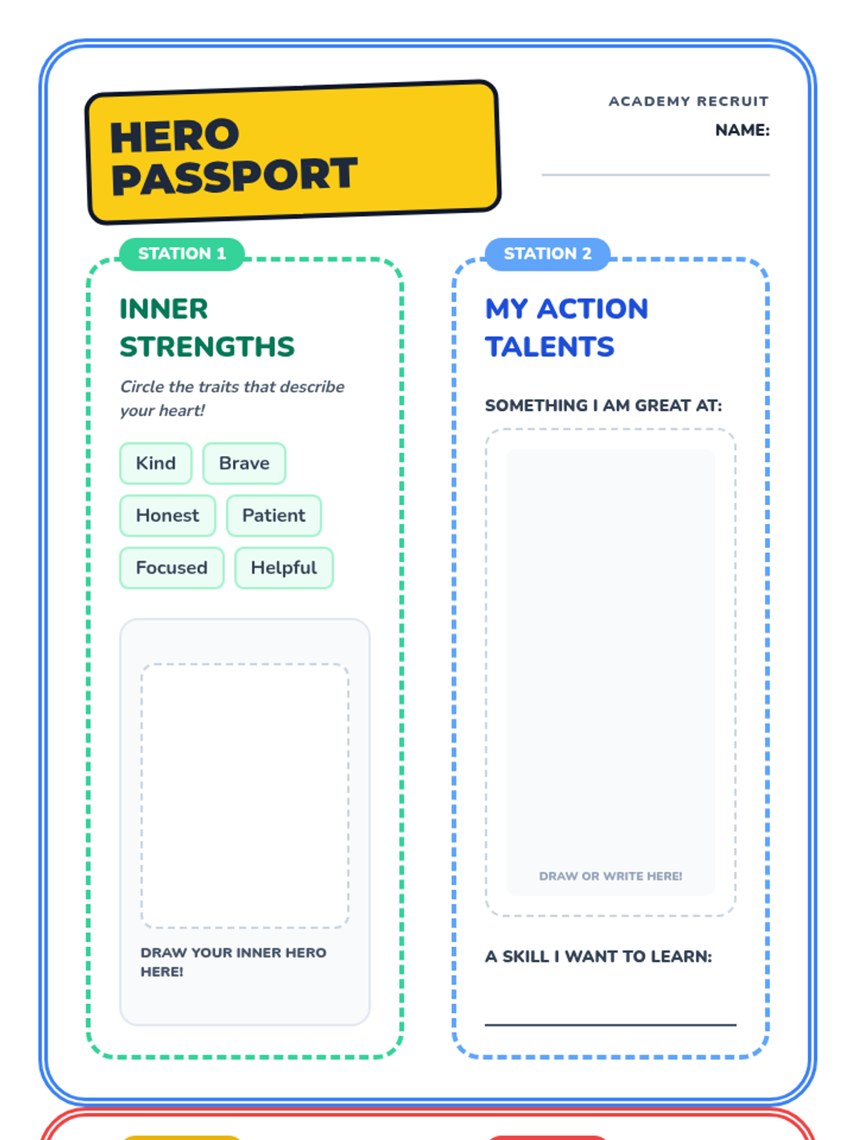 A two-page student handout styled as a 'Hero Passport' where students record their work from all four stations, including drawings of their strengths and reflections on teamwork.