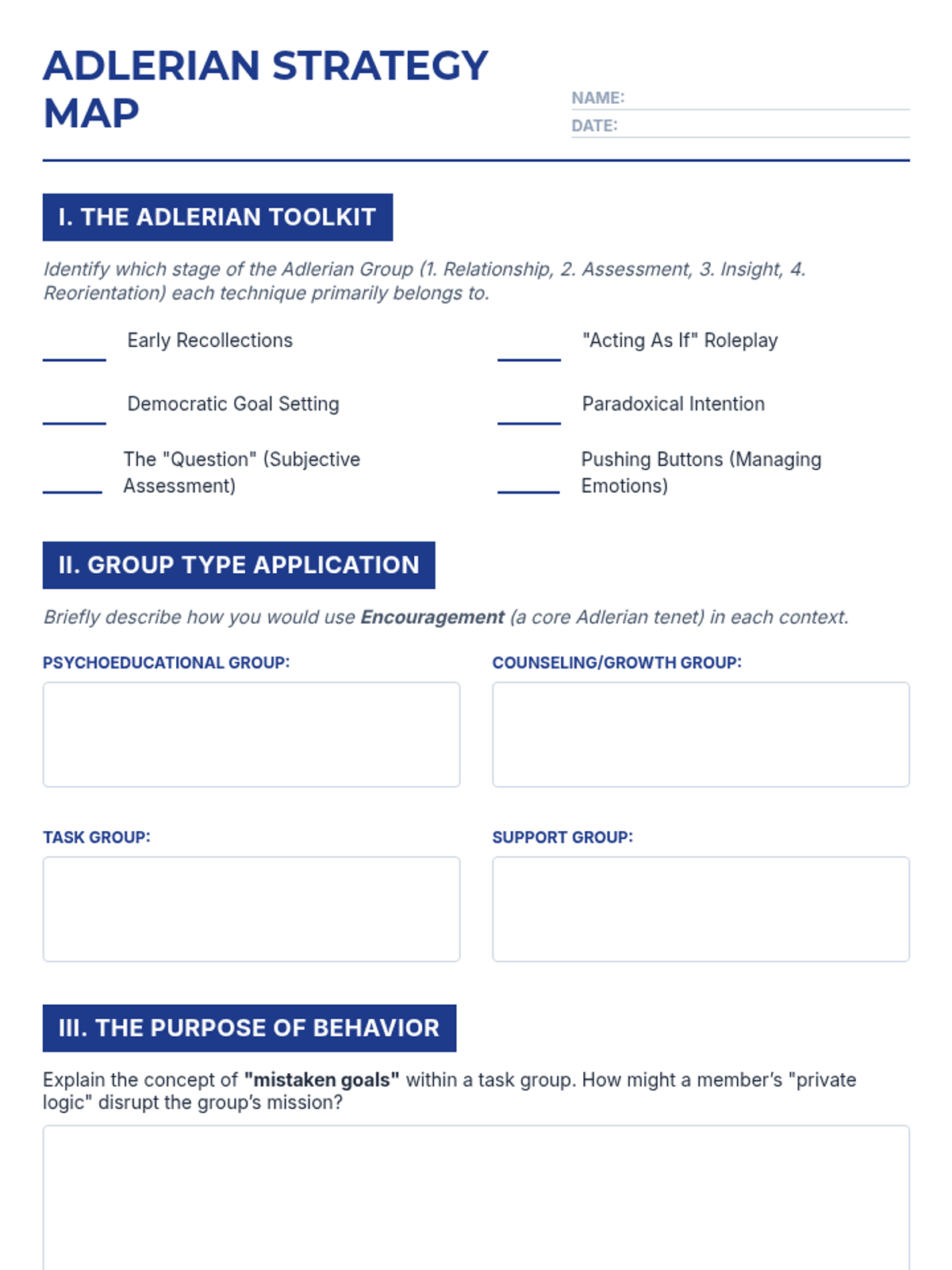 An application worksheet for students to map Adlerian techniques to group stages and reflect on the application of core tenets across different group types.