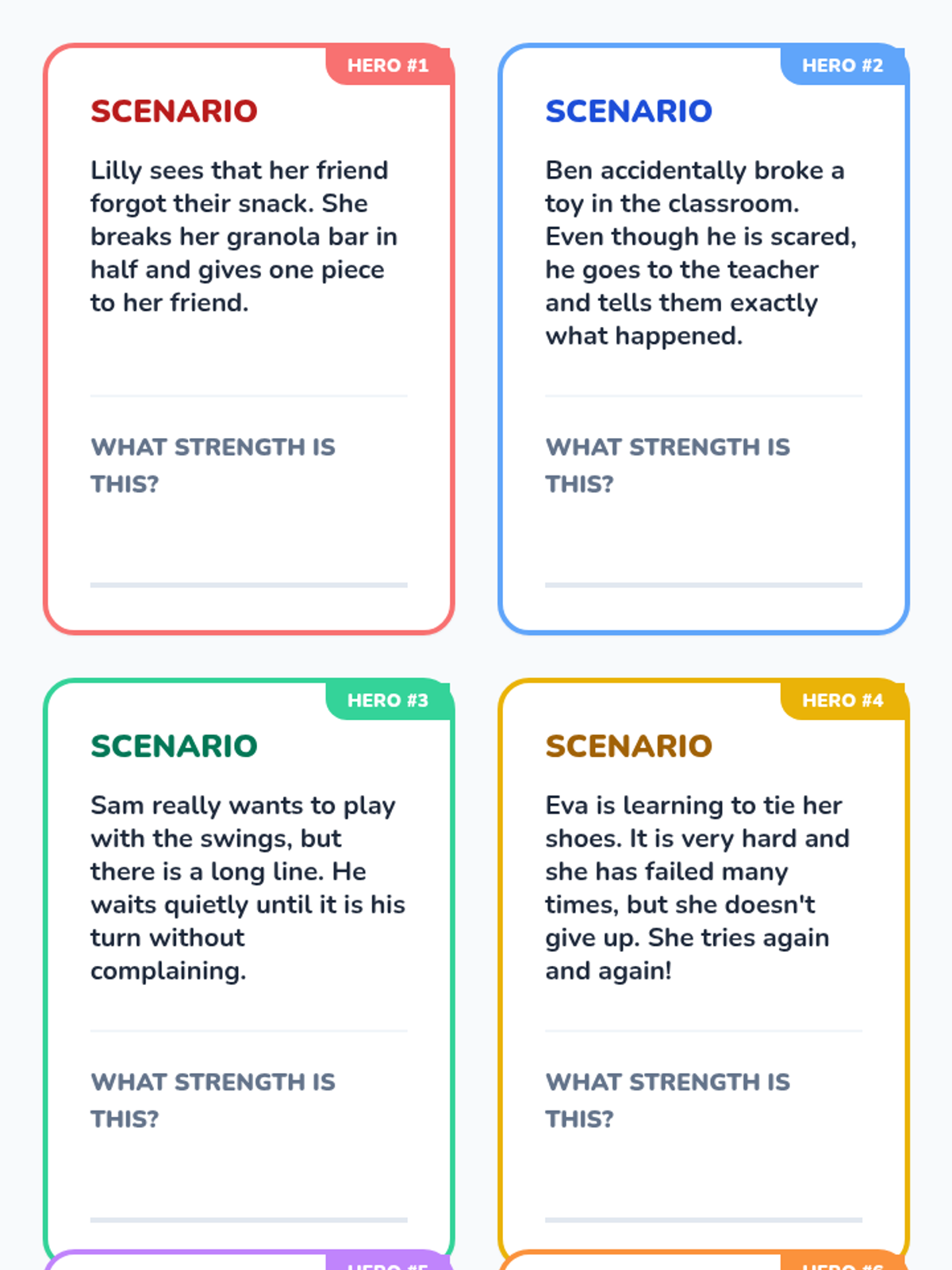 A set of printable task cards for Station 4, featuring relatable scenarios for 2nd graders to practice identifying character strengths in others. Includes a separate teacher answer key page.