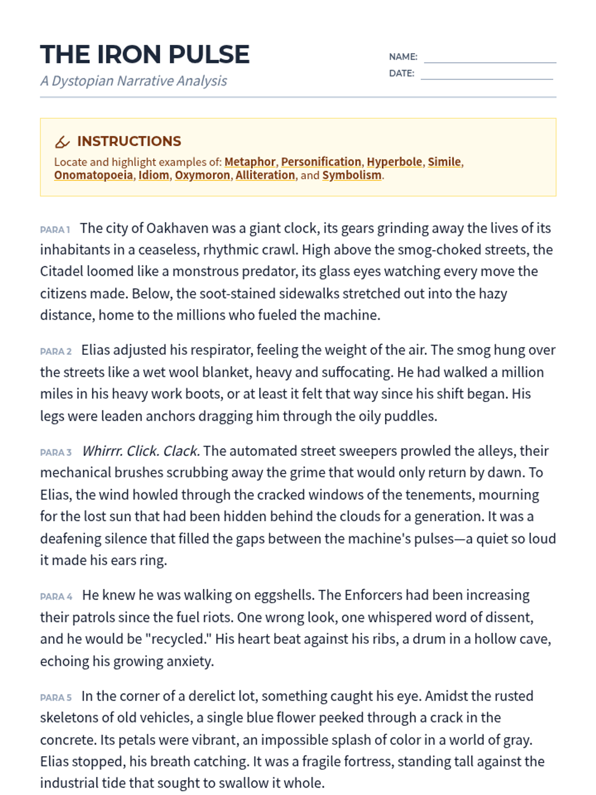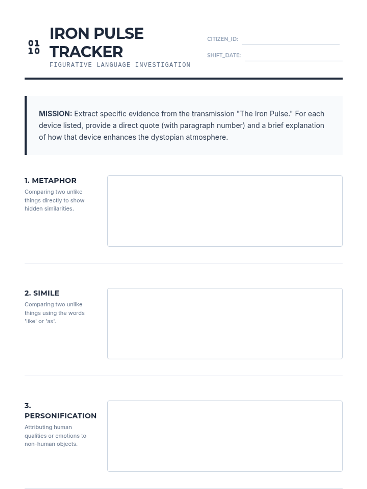 A two-page reading investigation document featuring an original thematic text "The Silicon Jungle" rich in figurative language. Includes a reader mission, identification chart, and a deep-analysis writing prompt. Updated for improved page breaks and workspace margins.
