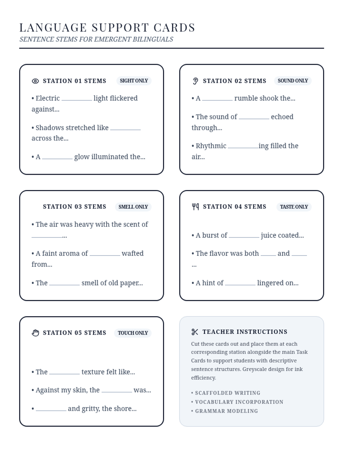 A set of targeted sentence stem support cards designed for Emergent Bilingual students, featuring an ink-efficient greyscale design for classroom printing.
