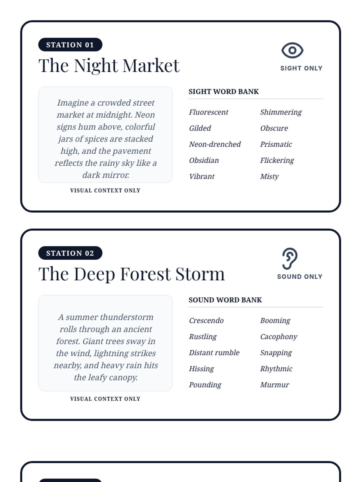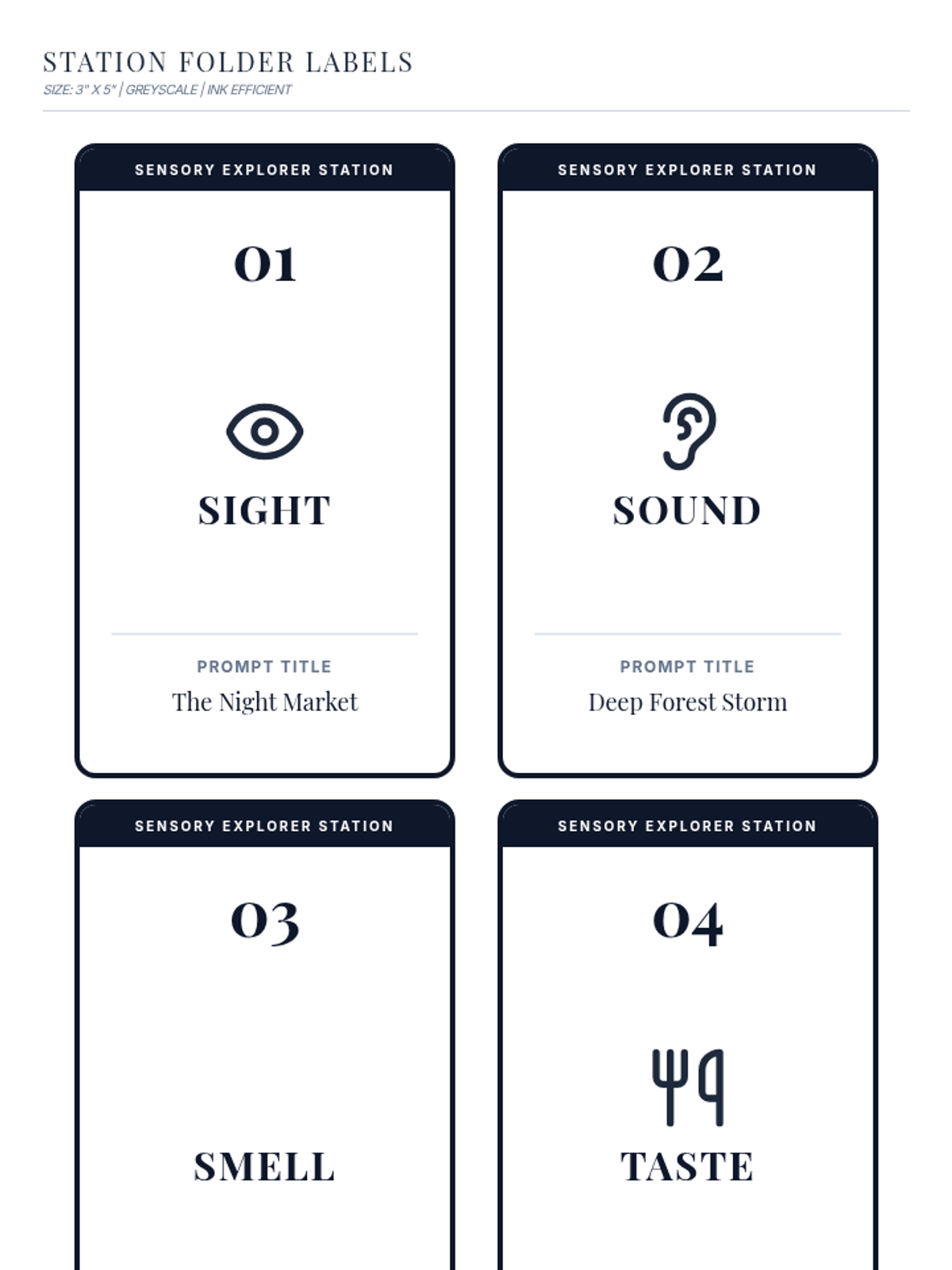A set of large, visually distinct task cards for each of the five sensory stations, featuring an image prompt, a specific sense focus, and a curated word bank for student inspiration. Greyscale design for high-contrast ink-efficient printing. Organized with two cards per page for clarity.