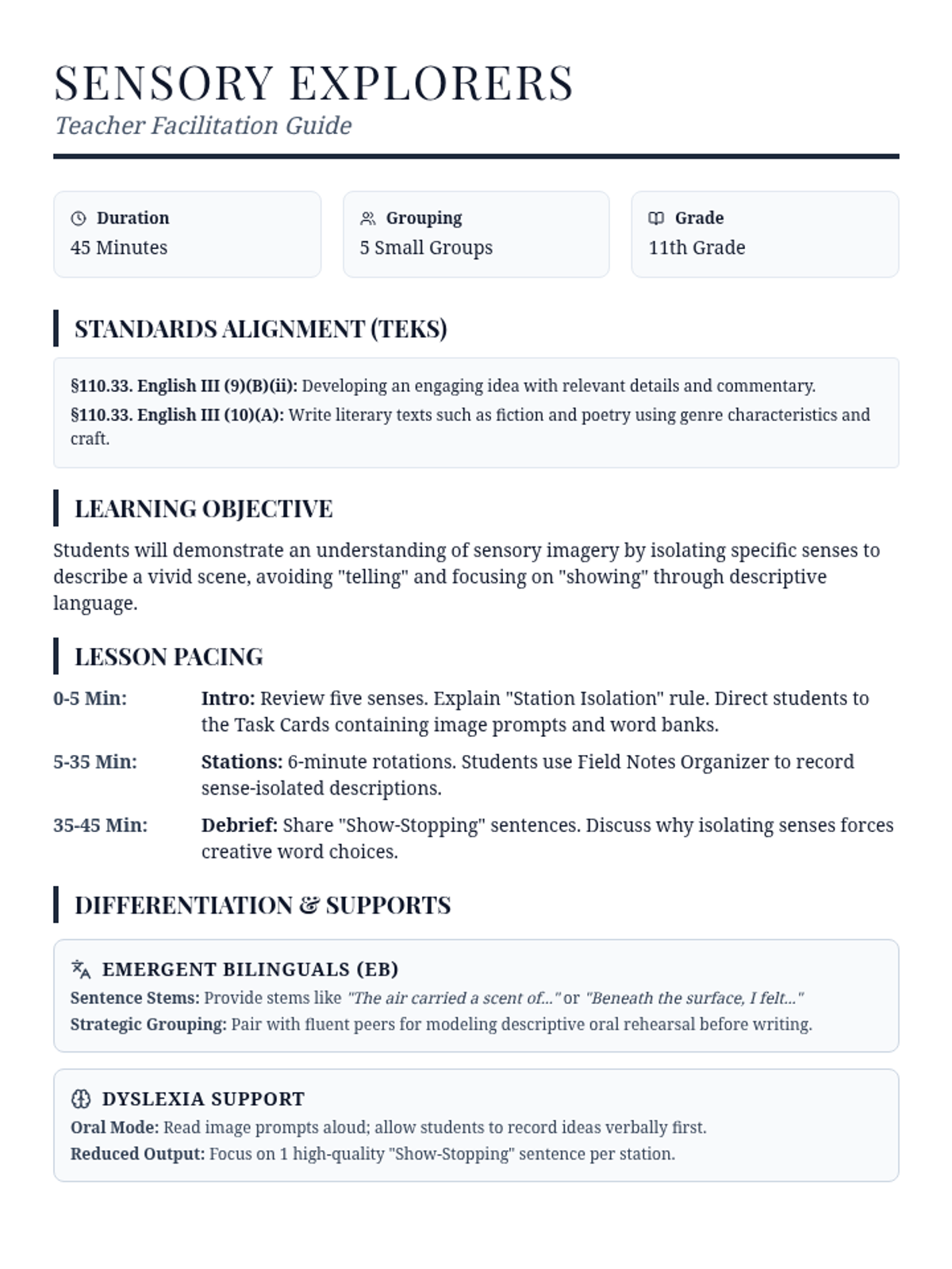 An updated teacher guide for the Sensory Explorers lesson, now including 11th Grade TEKS alignment and specialized supports for Emergent Bilingual and dyslexic students. Layout optimized for two-page printing and styled in greyscale for ink efficiency.