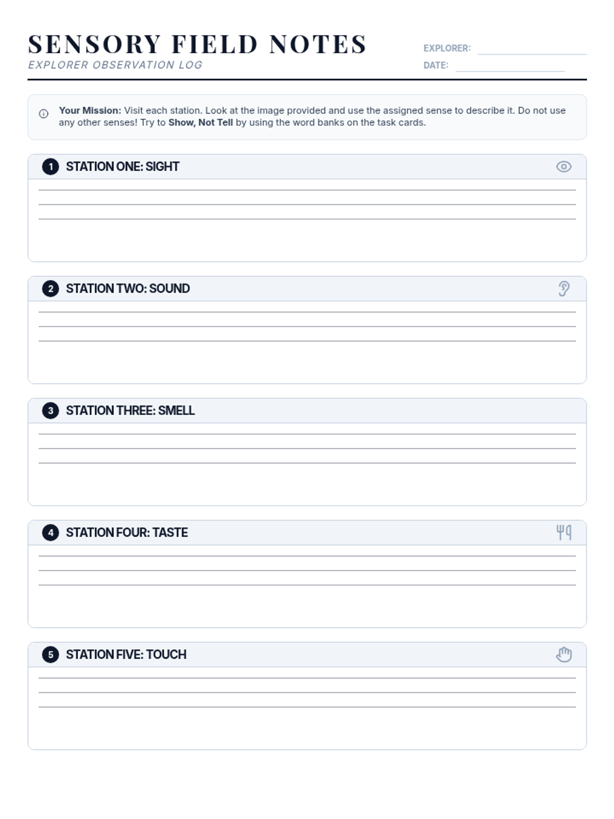 A professional graphic organizer for students to record their sensory descriptions for all five stations, featuring clean work areas with writing guides and sensory-themed icons in a printer-friendly greyscale layout.