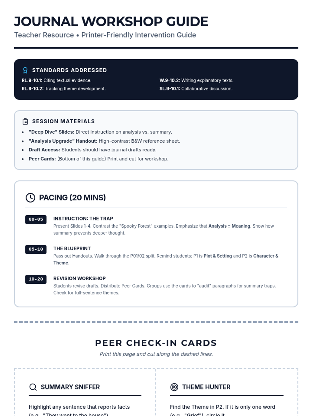 A facilitation guide for teachers to lead a high-impact workshop session aimed at fixing student journal entries, including pacing suggestions, talking points, and printable peer-feedback cards. Revised for page breaks and material checklist.