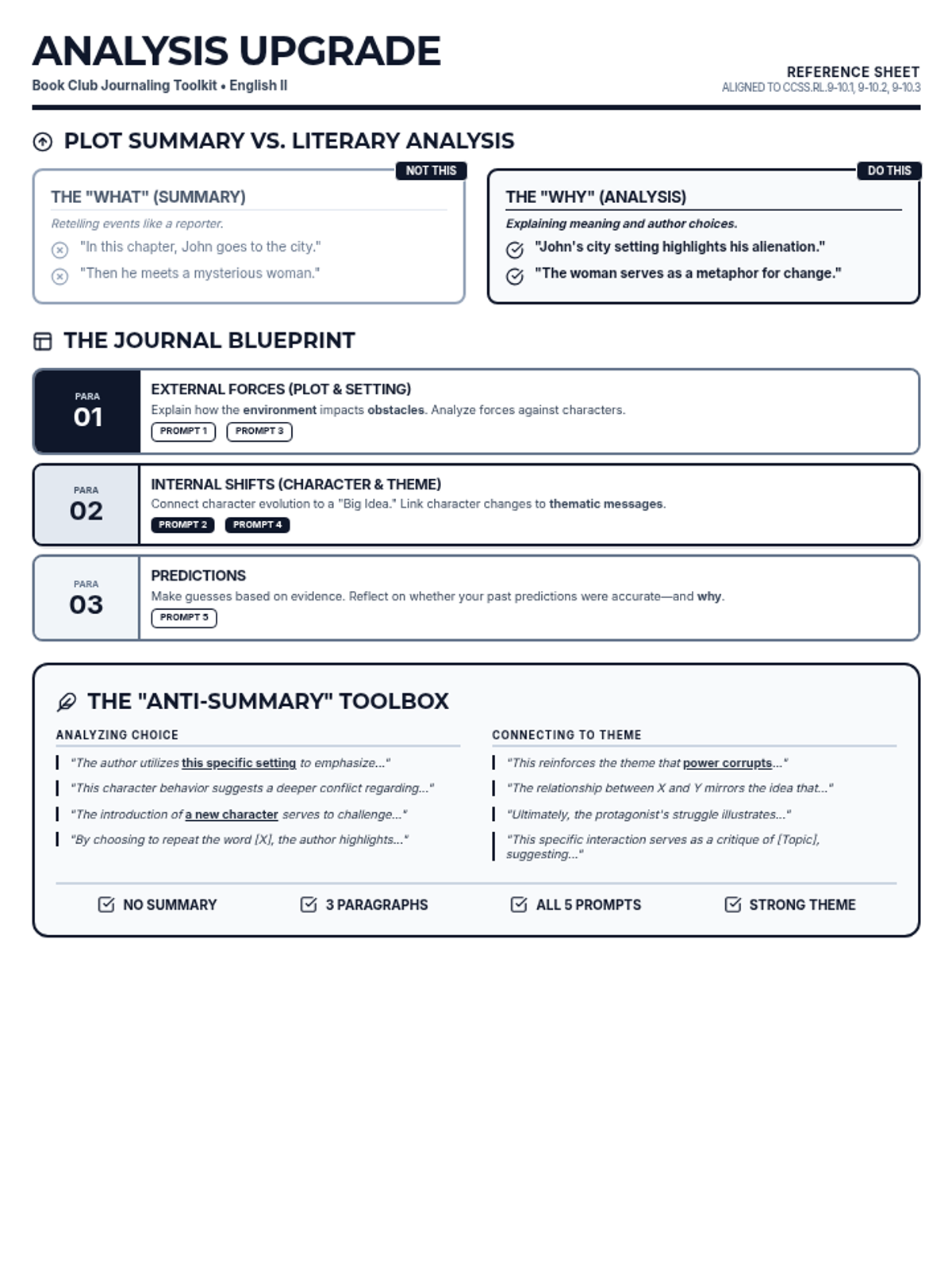 A comprehensive student reference sheet for 10th-grade English II that provides a structured paragraph blueprint, sentence starters for analysis, and clear distinctions between summary and critical thinking. Revised for page breaks and placeholders.