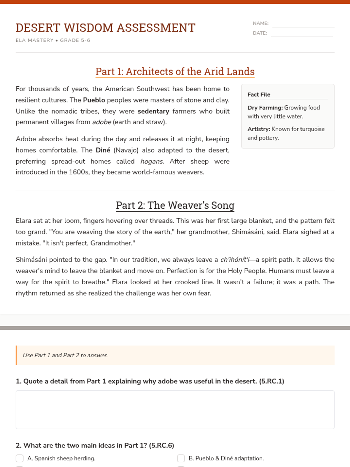 A 5-slide visual presentation to introduce the Desert Wisdom lesson. Covers the Pueblo and Diné cultures, key ELA skills (quoting evidence, identifying theme), and discussion prompts.