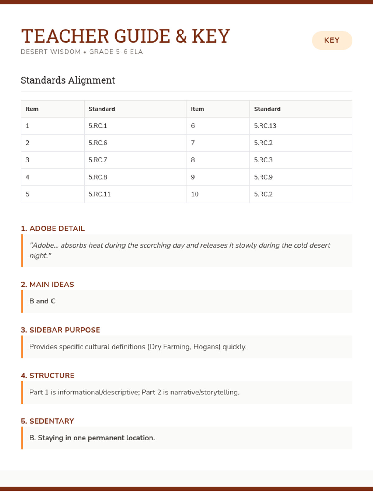 Teacher's answer key and standards alignment guide for the Desert Roots ELA assessment. Includes exemplar responses and scoring notes for all 10 questions.