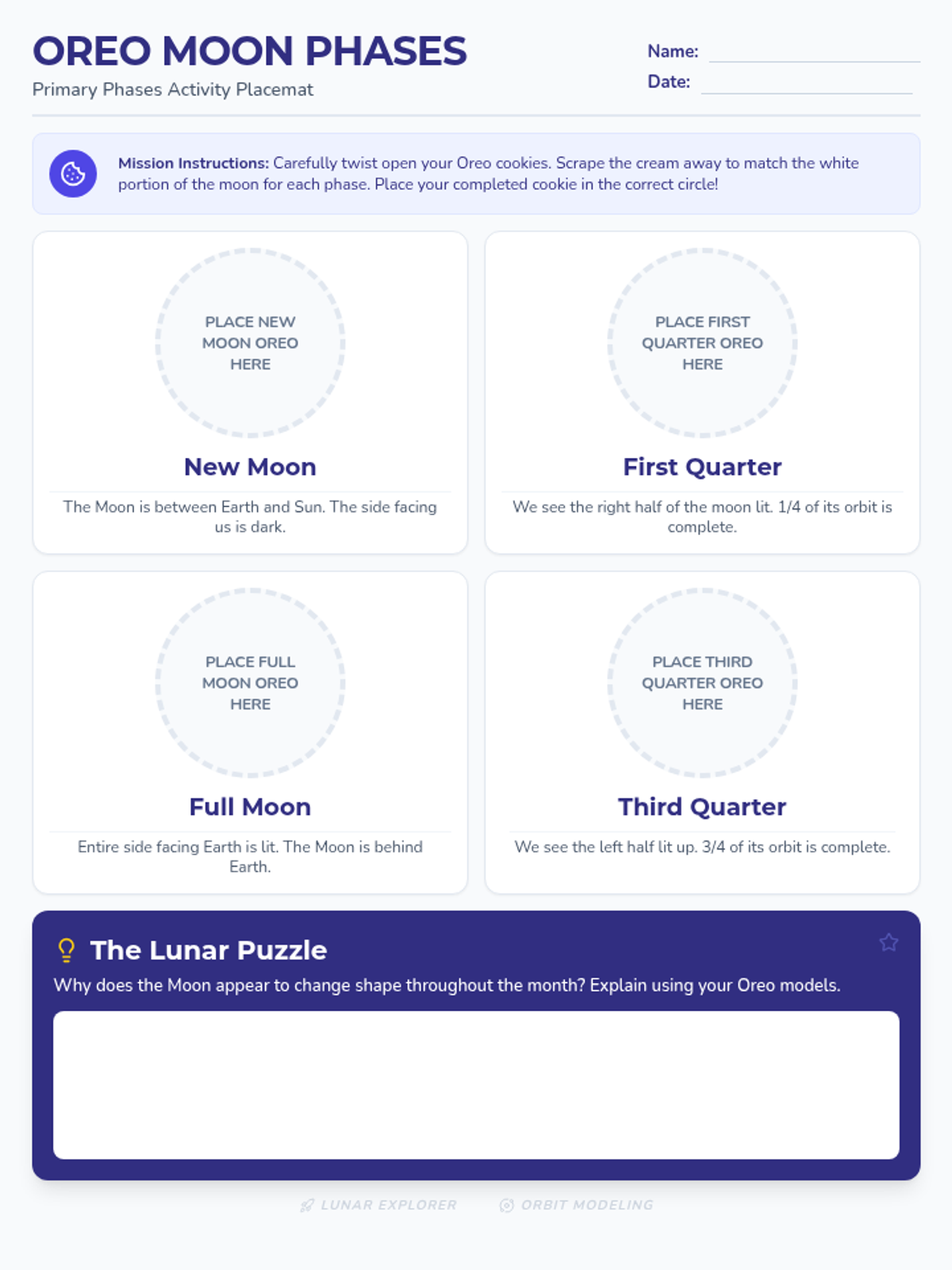 A hands-on activity placemat where students model the four primary phases of the moon using Oreo cookies, including descriptions and a reflection prompt. Revised to fit on a single page with appropriately sized cookie circles.