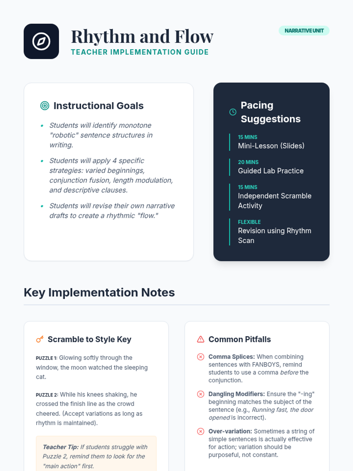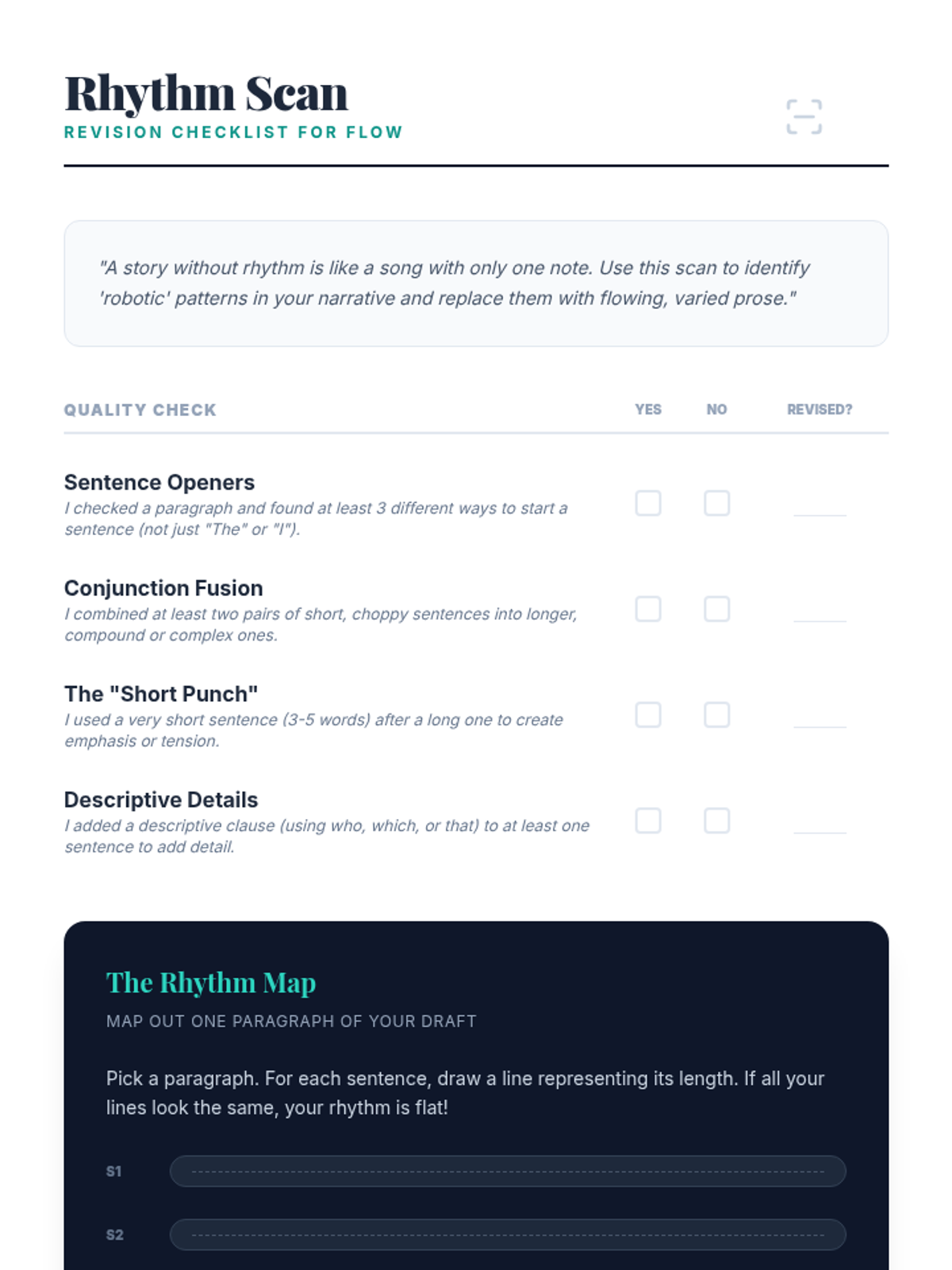 A revision checklist and visual mapping tool to help students analyze and improve the sentence rhythm and variation in their own narrative writing drafts.