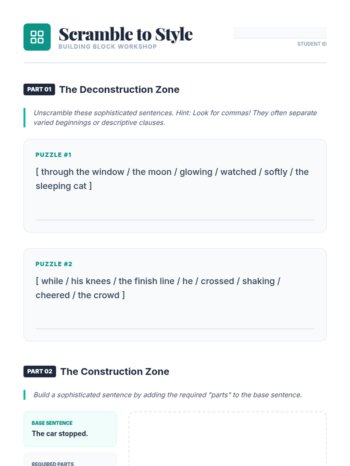 A sentence-building worksheet where students unscramble sophisticated examples and construct their own varied sentences using specific structural requirements.