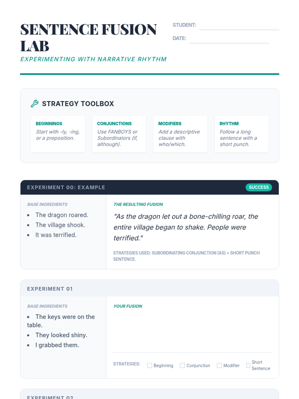 A graphic organizer for sentence combining practice, structured as a "lab" where students fuse basic sentences into complex, rhythmic prose using specific strategies.