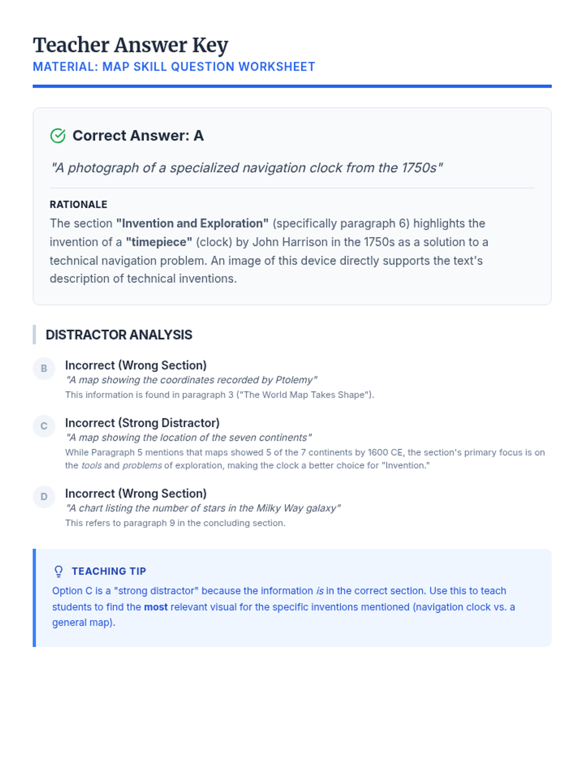 A teacher answer key and rationale for the Map Skill Question Worksheet, updated with a strong distractor from within the same section and improved layout.