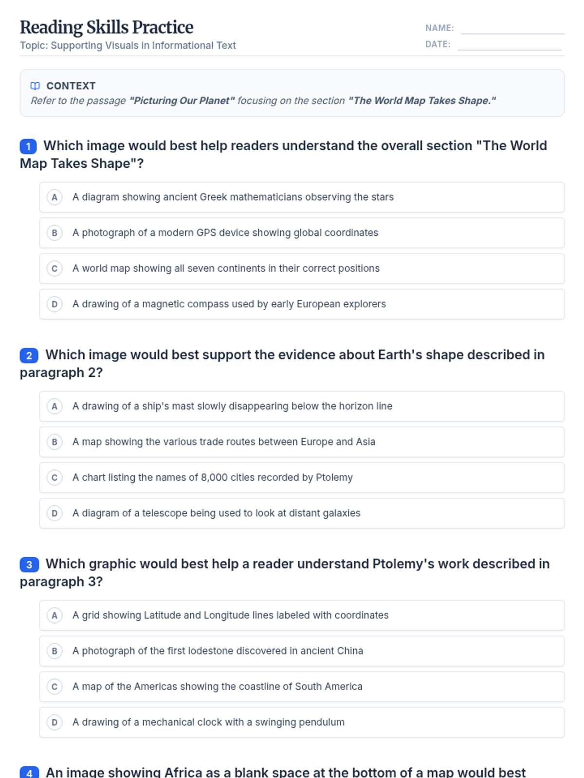 A 4-question multiple-choice worksheet focusing on identifying appropriate visual aids for the section 'The World Map Takes Shape' from the passage 'Picturing Our Planet'. Each question includes a strong distractor.