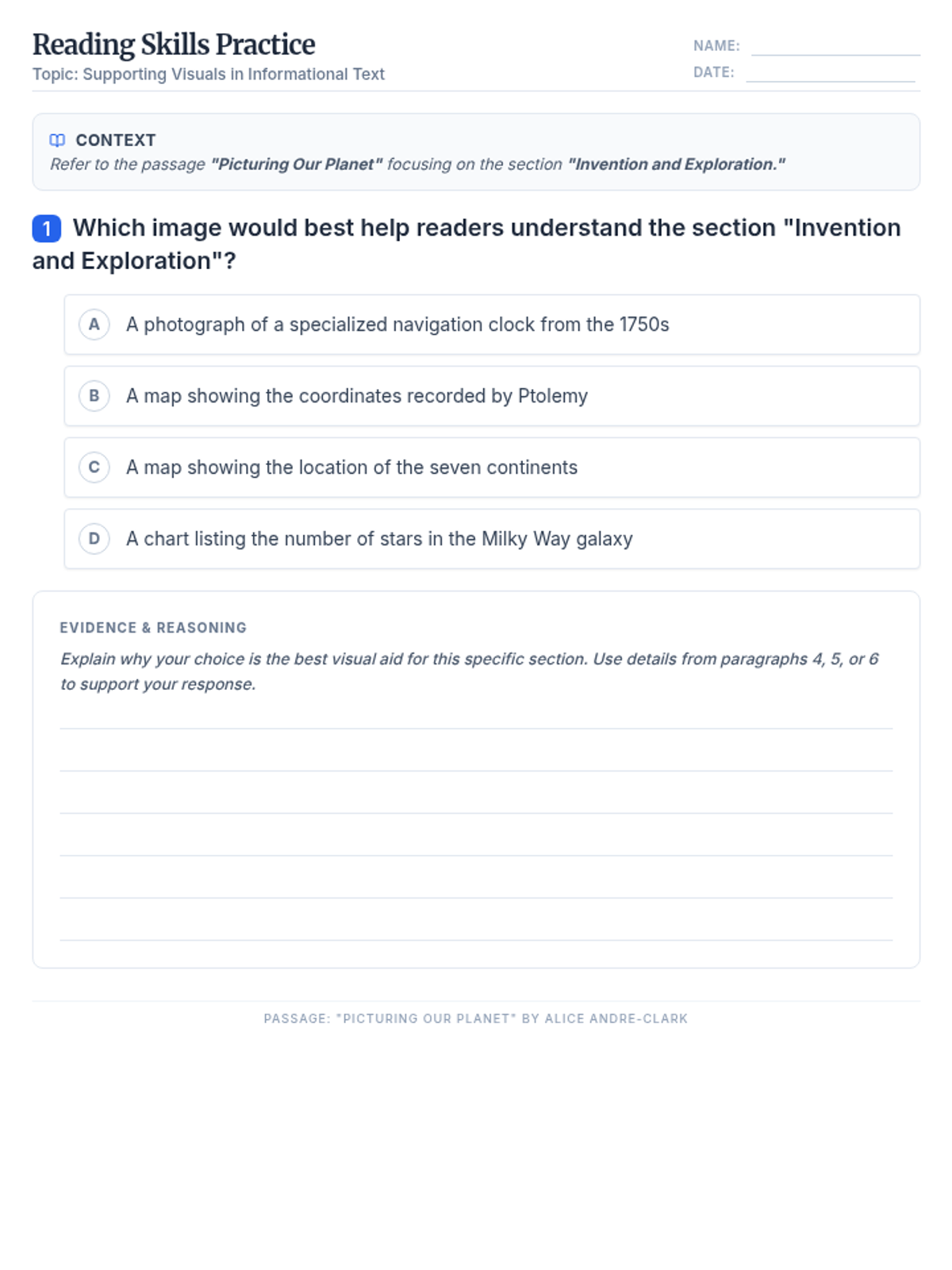 A single-question practice sheet focused on determining the best visual aid for the 'Invention and Exploration' section of the passage 'Picturing Our Planet'. Includes a written evidence section for students to justify their choice. Updated with a strong distractor from within the same section.