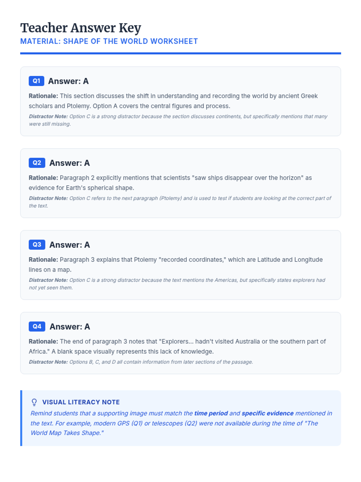 A teacher answer key and rationale for the Shape of the World Worksheet, including specific notes on distractor choices for each question.