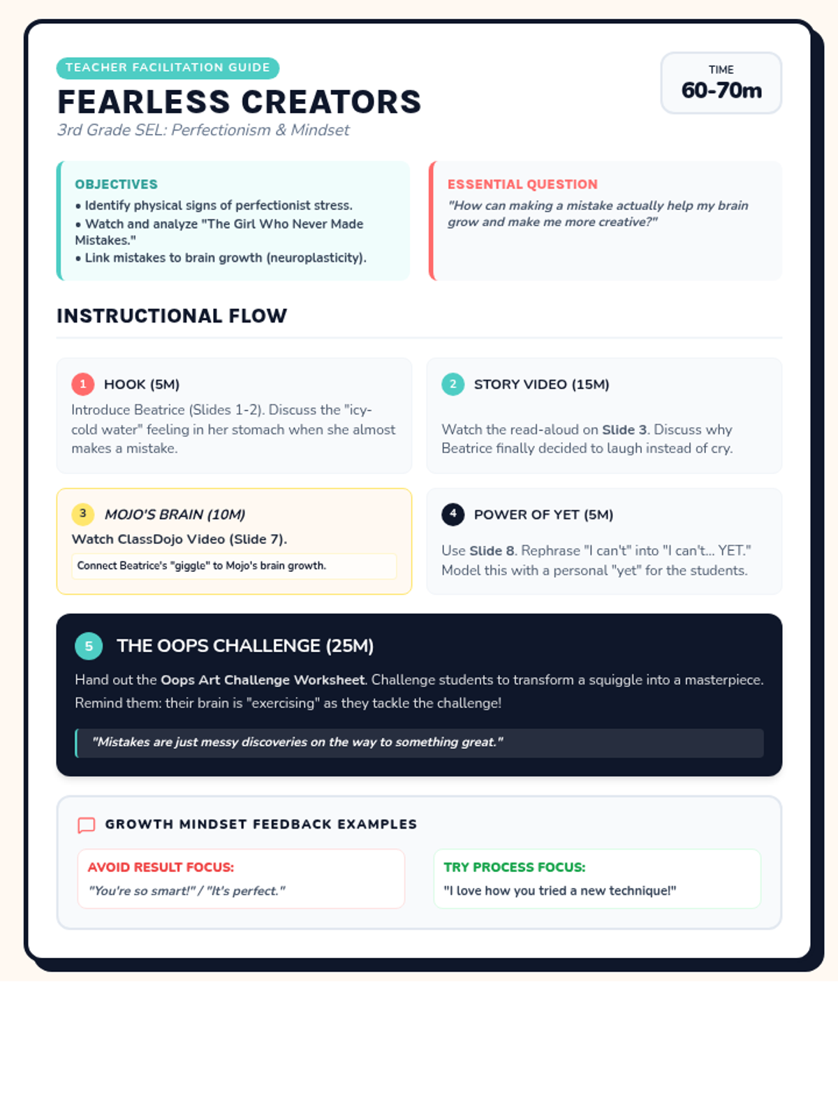 Updated facilitation guide for the 'Mistake Masterpiece' lesson. Now integrates two videos (story read-aloud and Mojo's Brain), linking Beatrice's story to neuroplasticity. Includes updated timing and instructional steps. Optimized for readability and contrast.