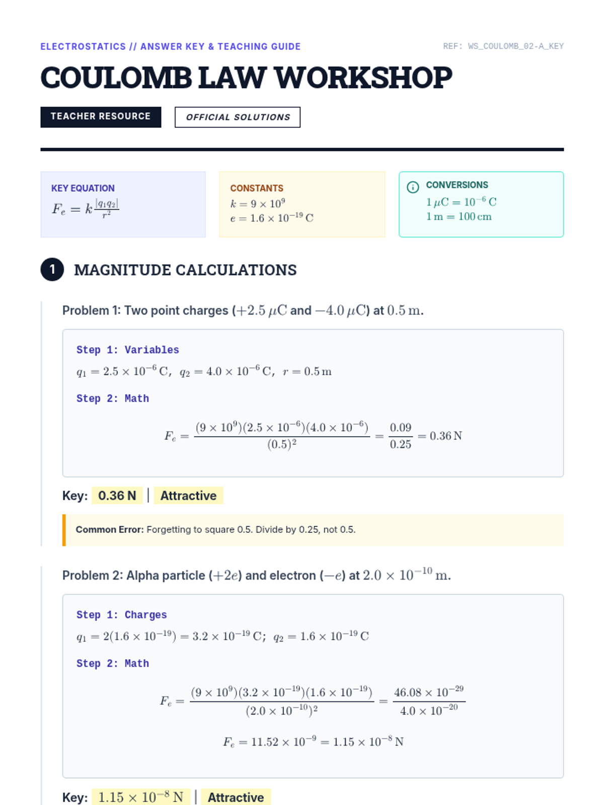 A comprehensive teacher answer key for the Coulomb Law Workshop, featuring step-by-step mathematical derivations, final answers highlighted for quick grading, and detailed sidebars for common student misconceptions and unit conversion reminders.