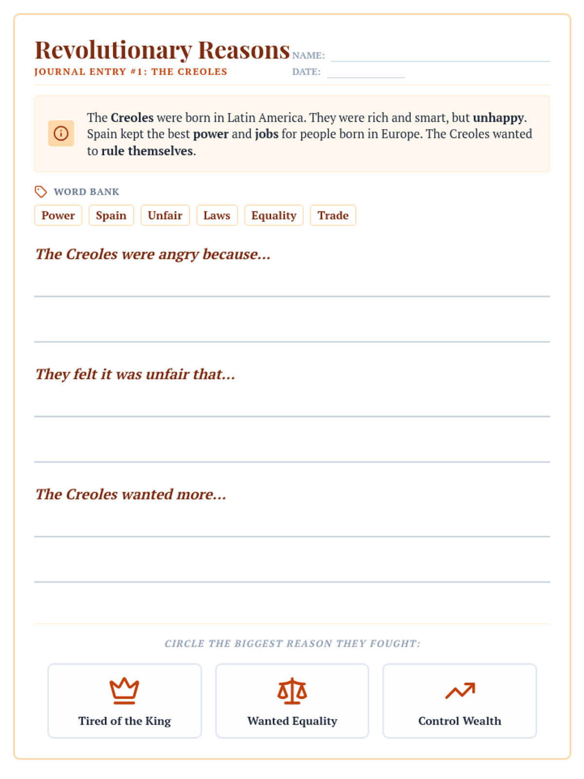 A structured journal entry worksheet for IEP students about the causes of the Creole revolution, featuring simplified text, sentence starters, a word bank, and visual response options.