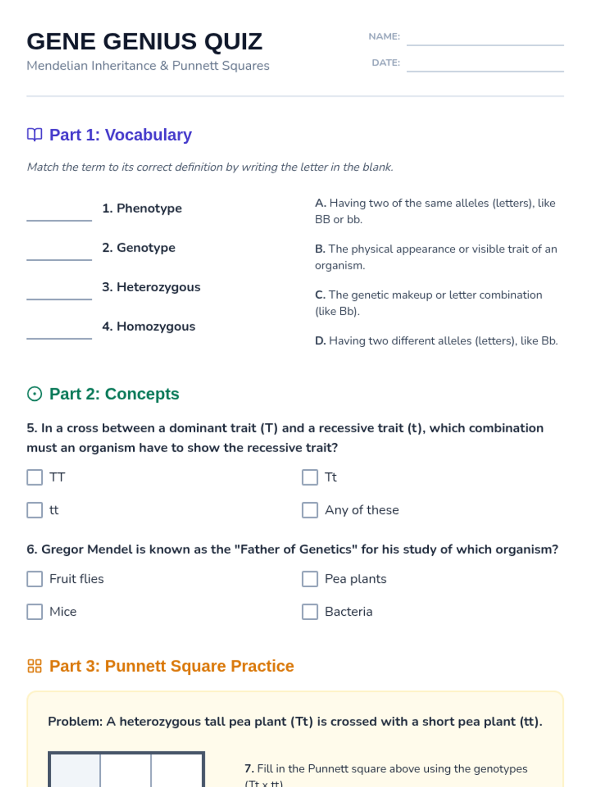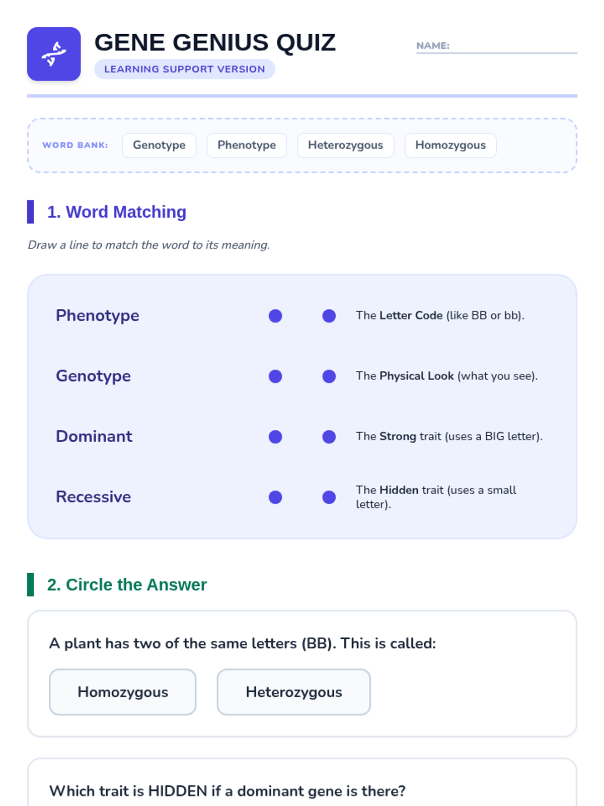A differentiated genetics quiz featuring simplified language, visual icons, guided Punnett square setup, and a word bank to support diverse learners.