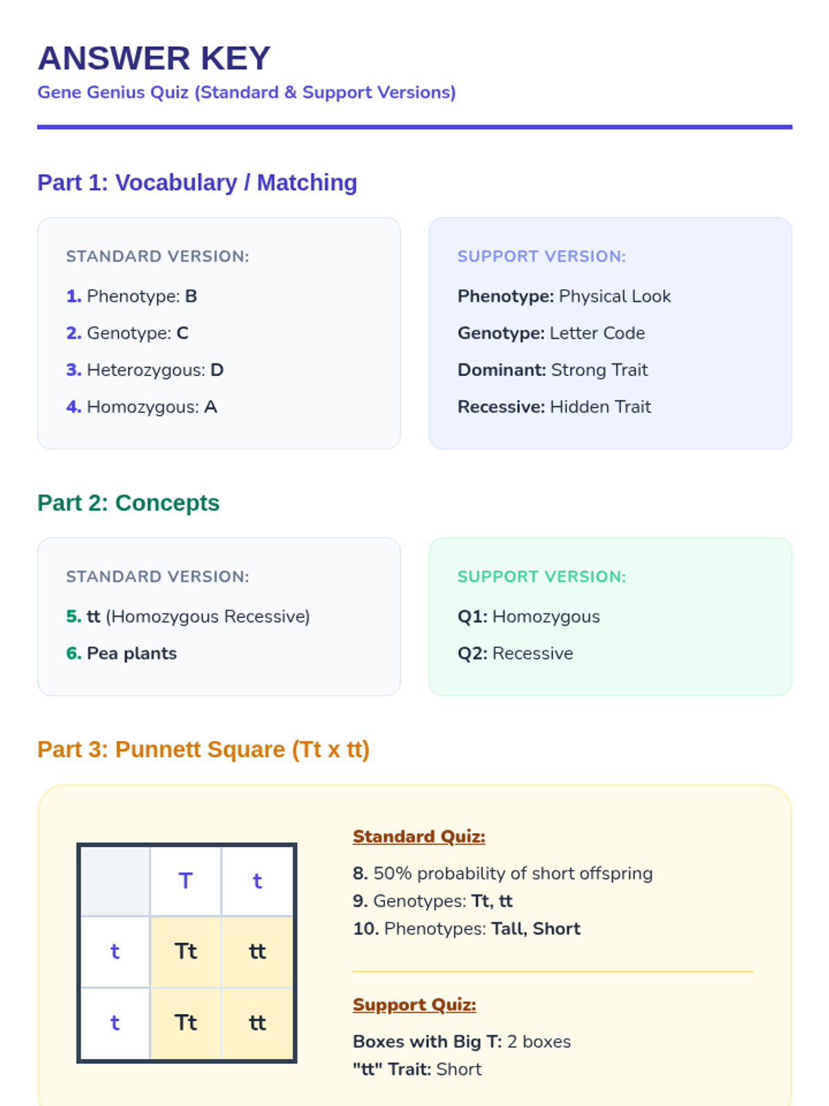 A comprehensive answer key for both the standard and support versions of the genetics quiz, including teacher tips for implementation.