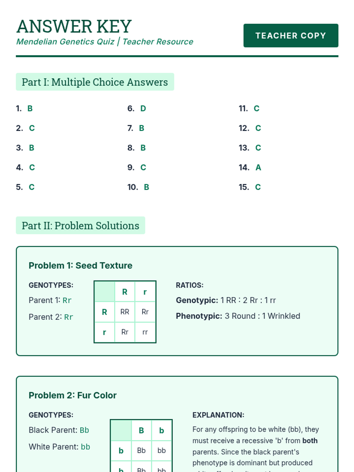 A complete answer key for the Mendelian Genetics Quiz, featuring the multiple-choice solutions and fully detailed Punnett squares for the problem-solving section.