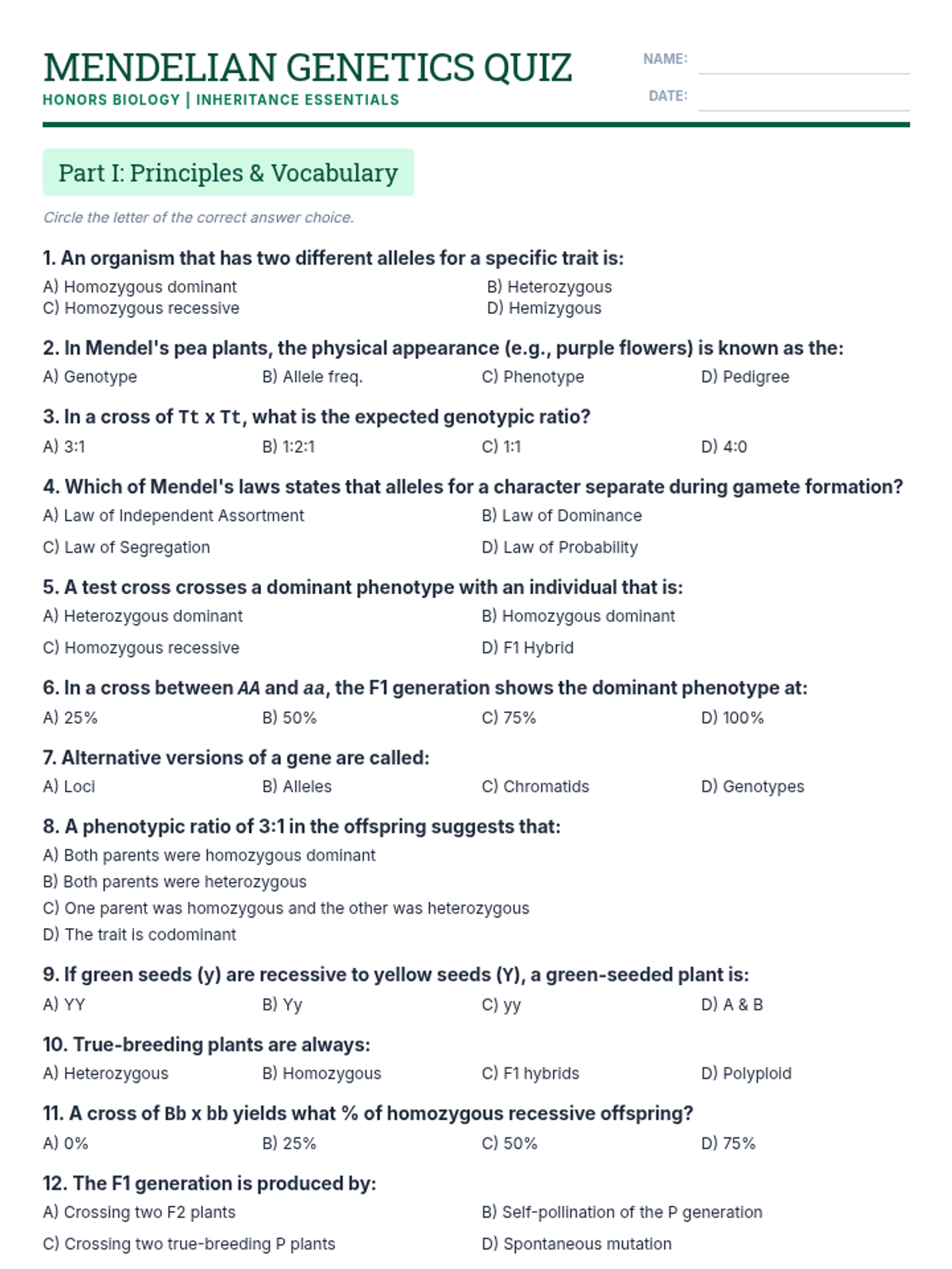A standard level genetics quiz covering Mendelian vocabulary, basic inheritance concepts, and Punnett square application.