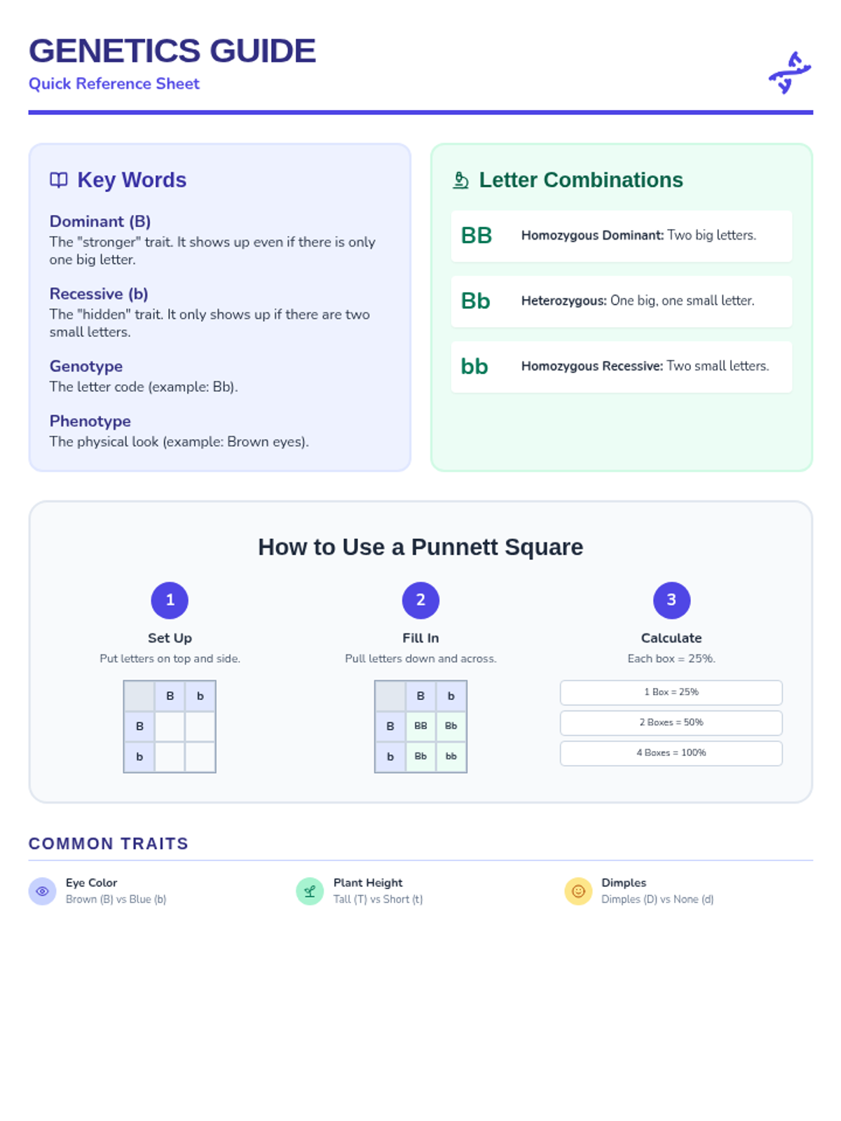 A visual reference sheet for students that defines key genetics vocabulary and provides a step-by-step guide to filling out Punnett squares.