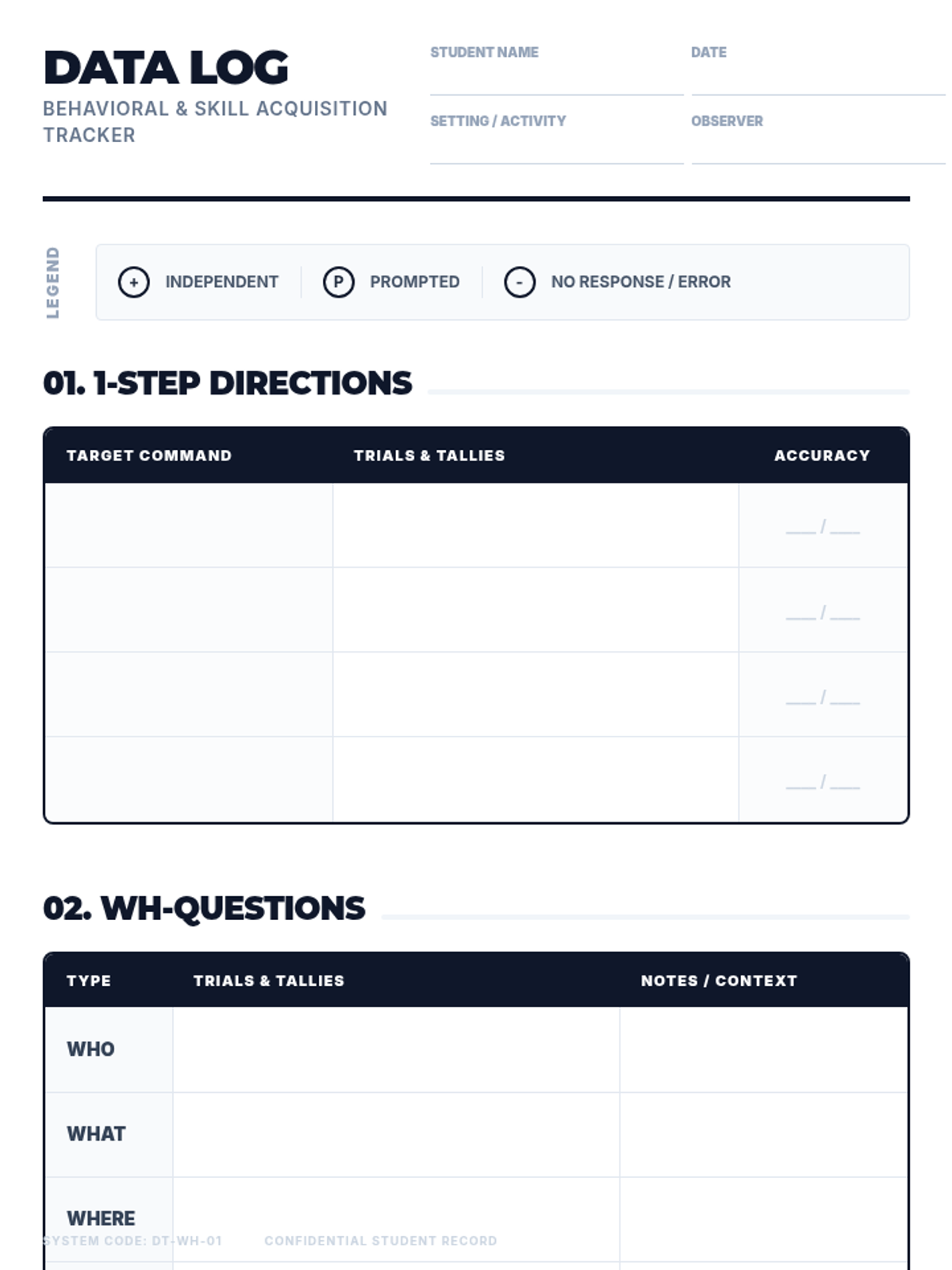 A high-contrast, professional data collection sheet designed for recording 1-step directions and WH-question responses using a clean tally system.
