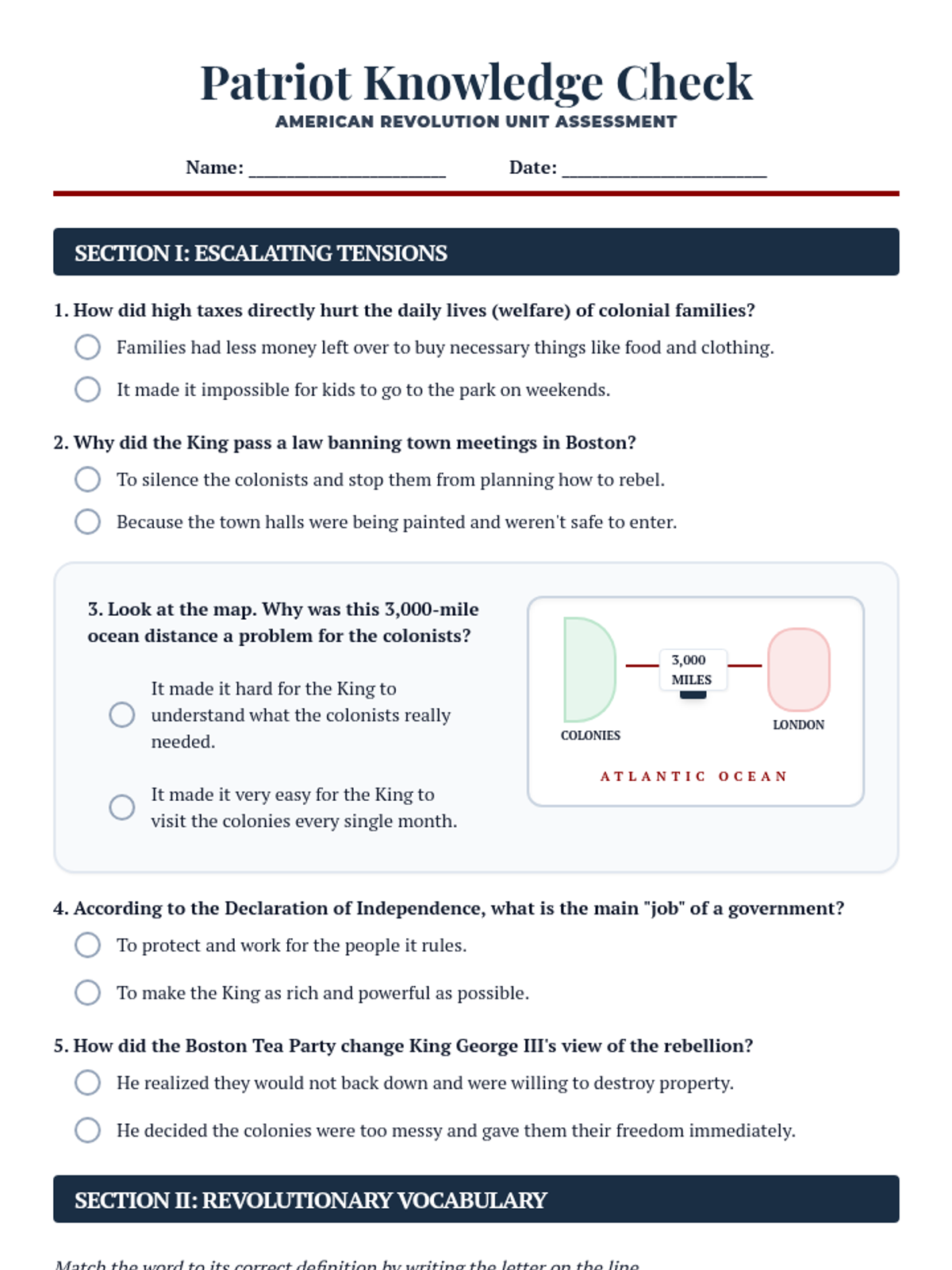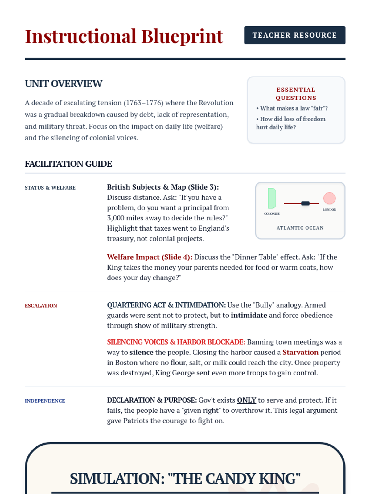 An updated kid-friendly 18-slide presentation for 4th graders. Now includes recognizable landmass shapes on the map (Slide 3), fixed spacing for the final slide header, and specific details on how taxes and the harbor closing hurt families (unable to get food/clothes), how the King used military force to intimidate colonists, and the banning of town meetings to silence their voices. Analogies like 'The Bully watching you everywhere' and 'Starving Boston' make the historical context clear for young learners. Fixed spacing on the final summary slide.