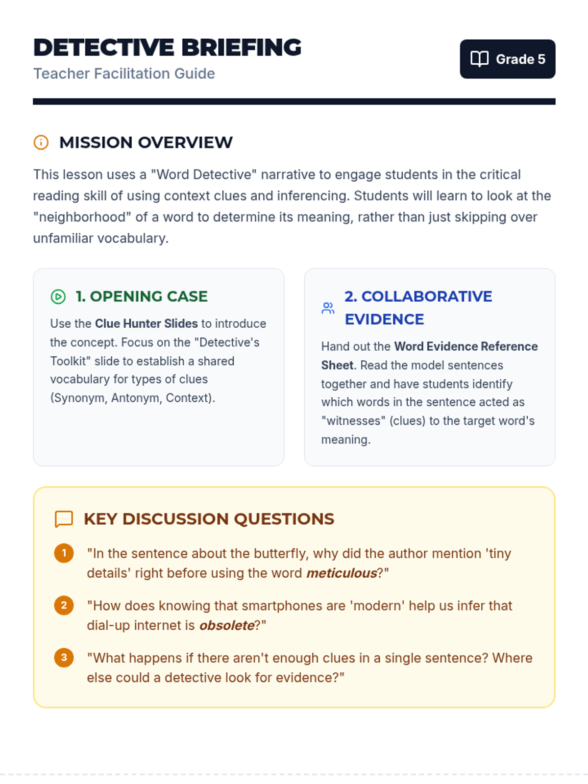 A teacher's guide for the Word Detective lesson, providing instructional flow, discussion questions, and additional vocabulary for modeling.