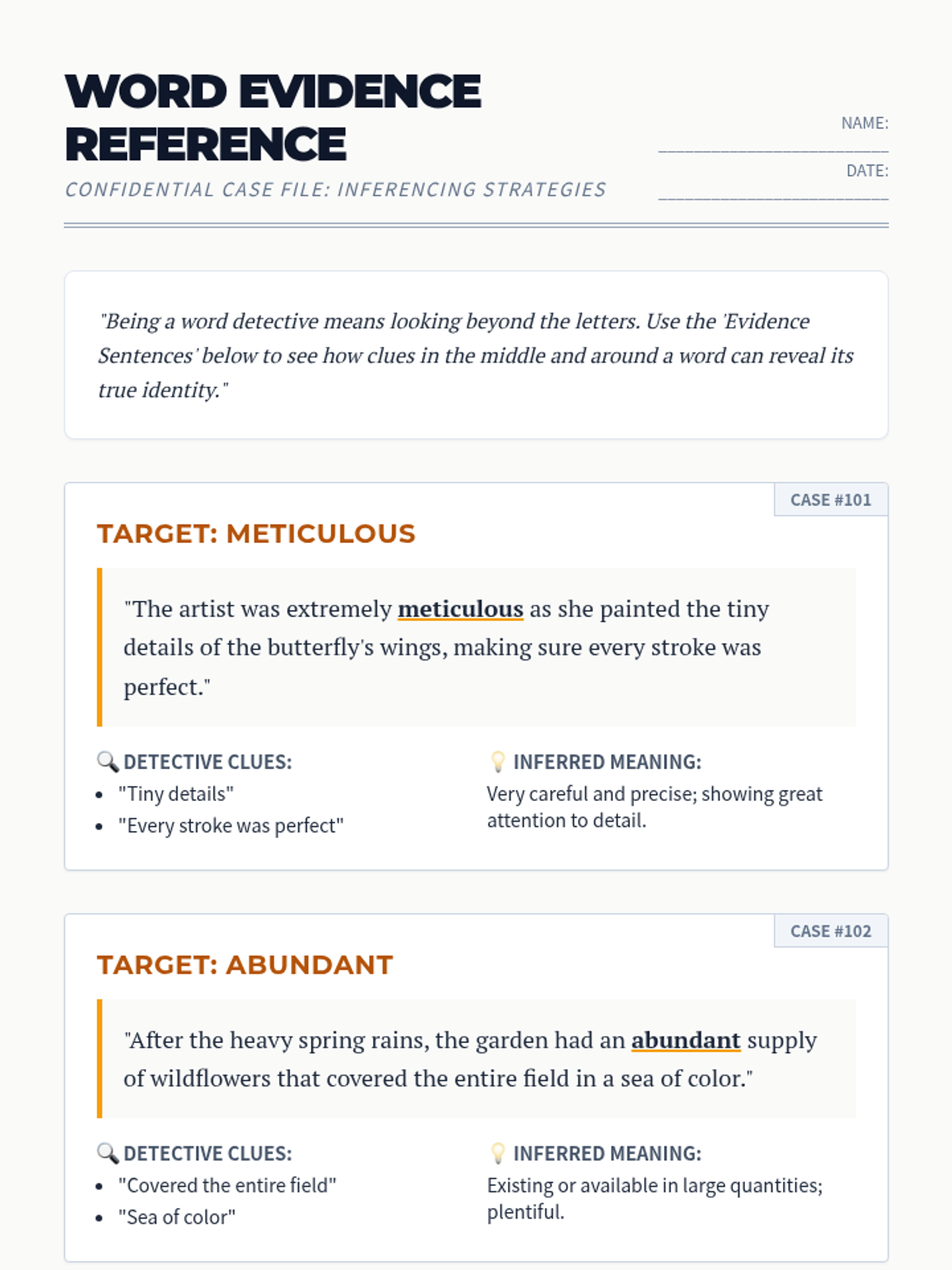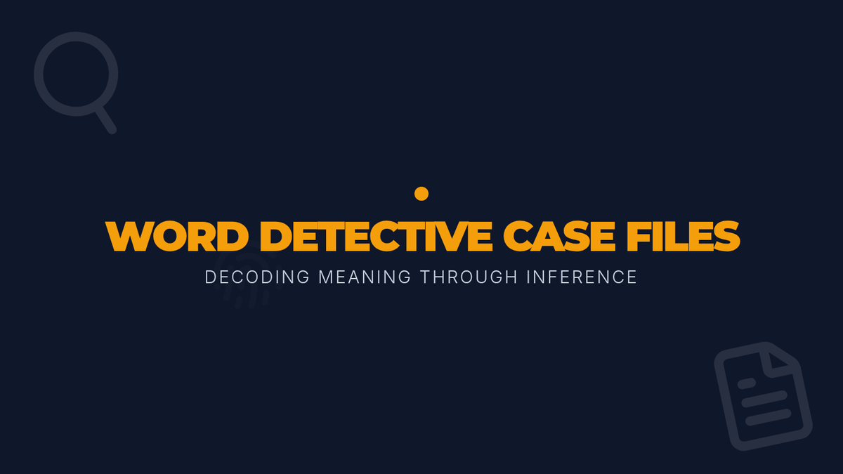 Instructional slides for teaching students how to use context clues and inferencing to determine word meaning, featuring a 'Word Detective' theme.