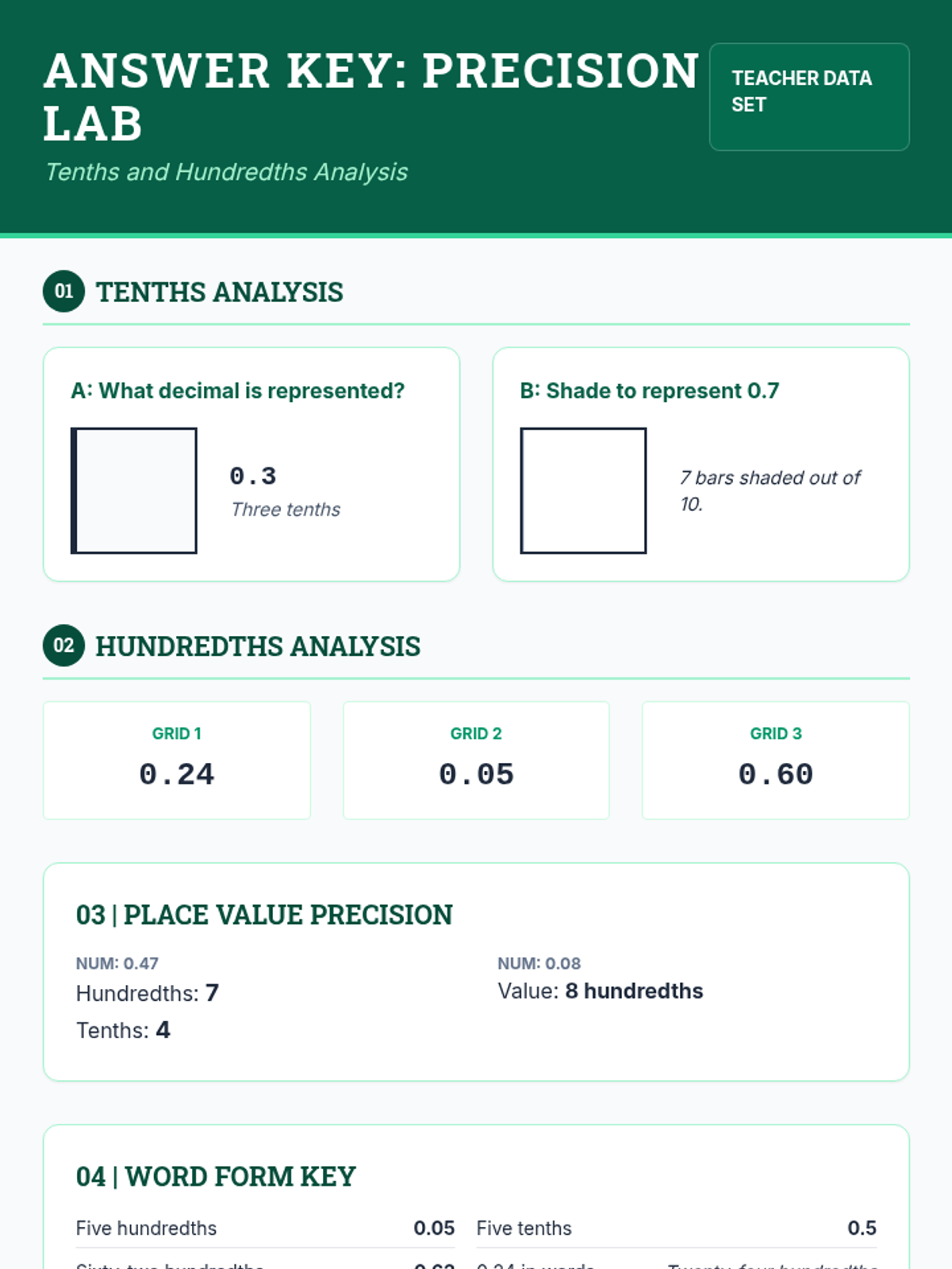 The answer key for the Precision Lab worksheet, providing correct decimal values, word forms, and explanations for teacher use.