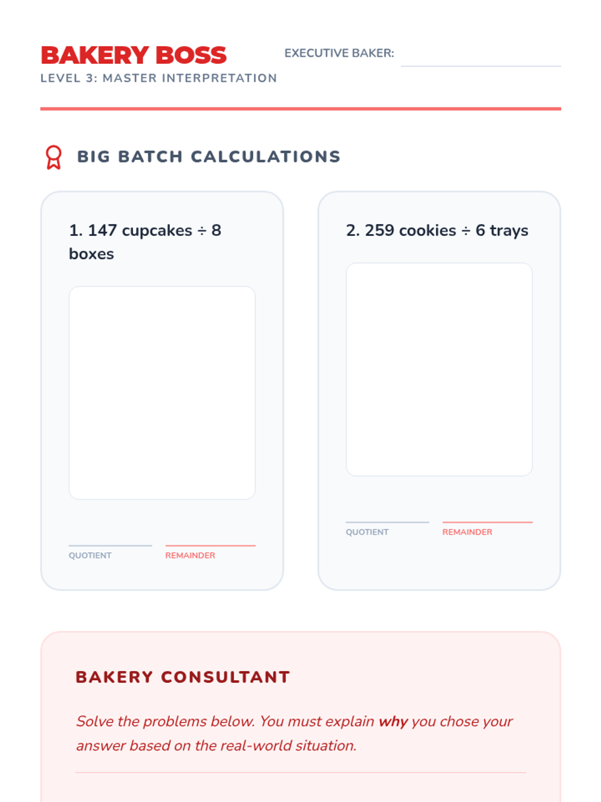 A challenge-level worksheet (Level 3) for division with remainders, focusing on larger numbers, multi-step word problems, and detailed reasoning for remainder interpretation.