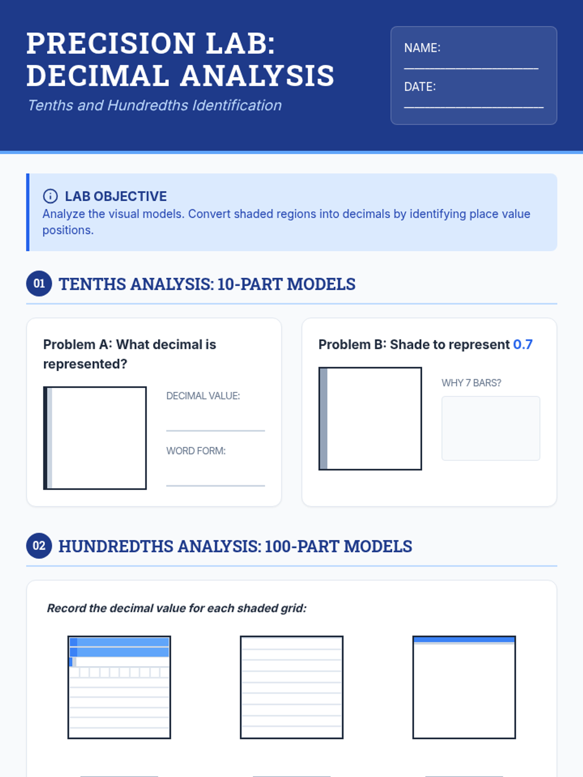 A comprehensive worksheet for identifying and representing tenths and hundredths using visual grids, place value identification, and word form conversion.